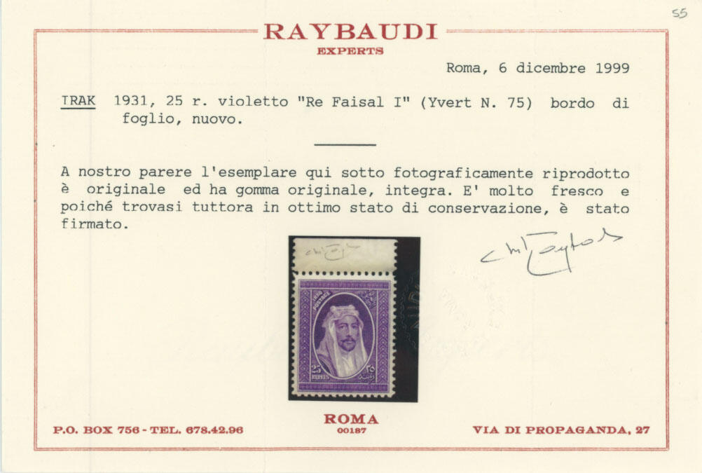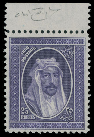 | Zusatzinformationen und Suchstichworte: | Raritan Stamps - 94. Auktion 26. - 29. Oktober 2022 Los 602 Irak 1931, König Faisal I, 25 R. violett, Oberrandstück, ausgezeichnete Zentrierung und postfrisch, vollständiger Originalgummi, postfrisch (hell Falzspur auf Seitenrand), Pracht und sehr selten in einem guten Zustand, Raybaudi Attest, Katalogwert $3,400, SG #92, £2,500 als gefalzt, $3,000-$4,000 Ausruf 2.100,00 USD |