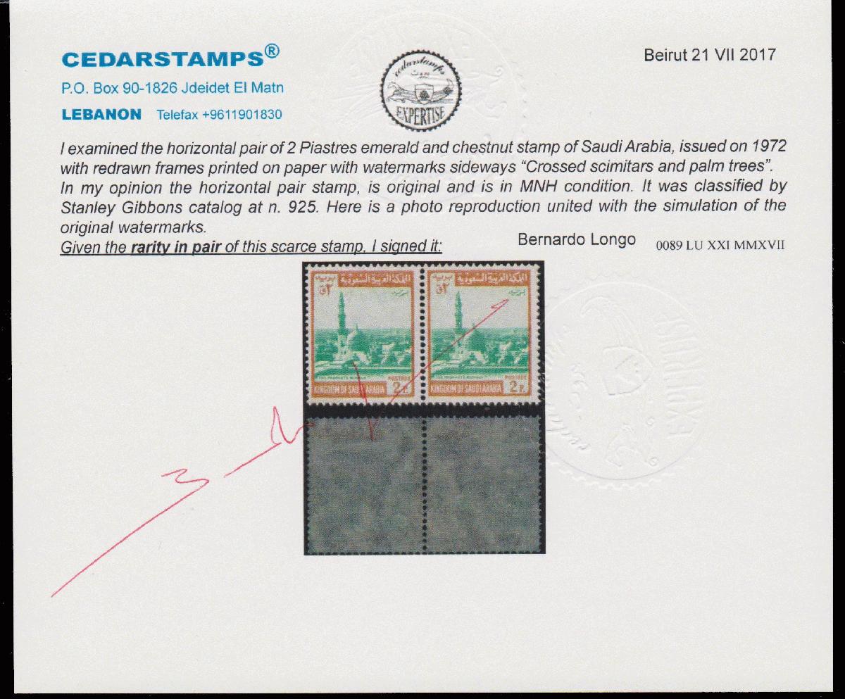 | Zusatzinformationen und Suchstichworte: | 34. Cedarstamps Auktion 19. November 2022 Los 342 Saudi Arabien Saudi-Arabien. Postfrisch 1972, 2 Piaster smaragd und kastanienbraun mit Wasserzeichen "durchquerten Krummsäbel und Palmbäumen" im waagrechten Paar (SG n 925 x 2). Bernardo Longo photoexpertise. Selten Paar dieser seltenen Marke Ausruf 150,00 EUR |