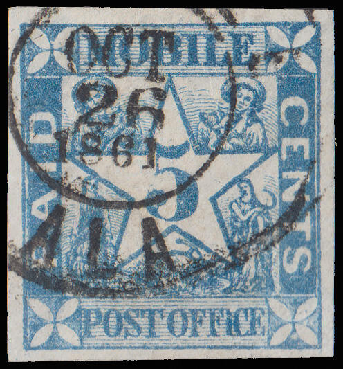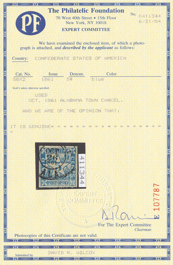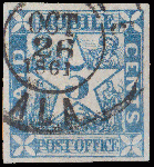 | Zusatzinformationen und Suchstichworte: | Kelleher Auktion 2002. - The Kelleher Club Sale 18. - 20. Oktober 2022 Los 2137 Konföderierte Staaten Postmaster Ausgaben Mobil, Ala. 1861,5¢ blau (Scott 58X2), gleichmäßig breite Ränder und sauber mobil Zweikreisdatumsstempel, Oct 26,1861, Pracht, mit ein 2004 P. F. Attest. Scott $450. Ausruf 100,00 USD |