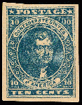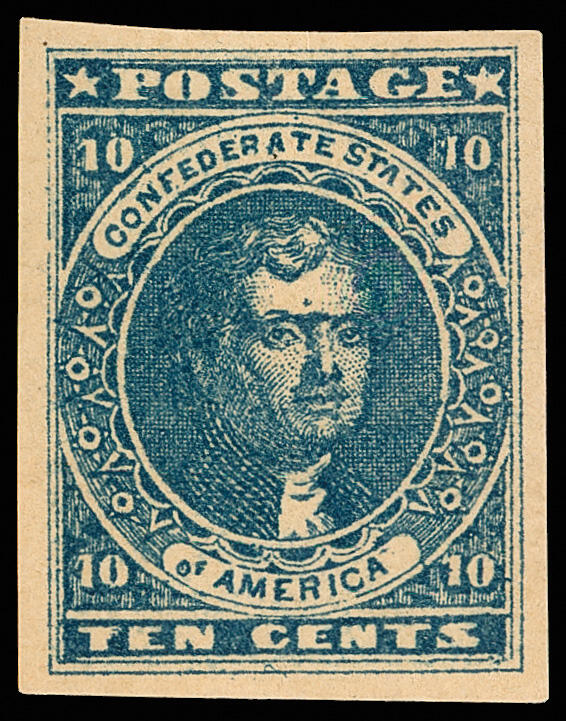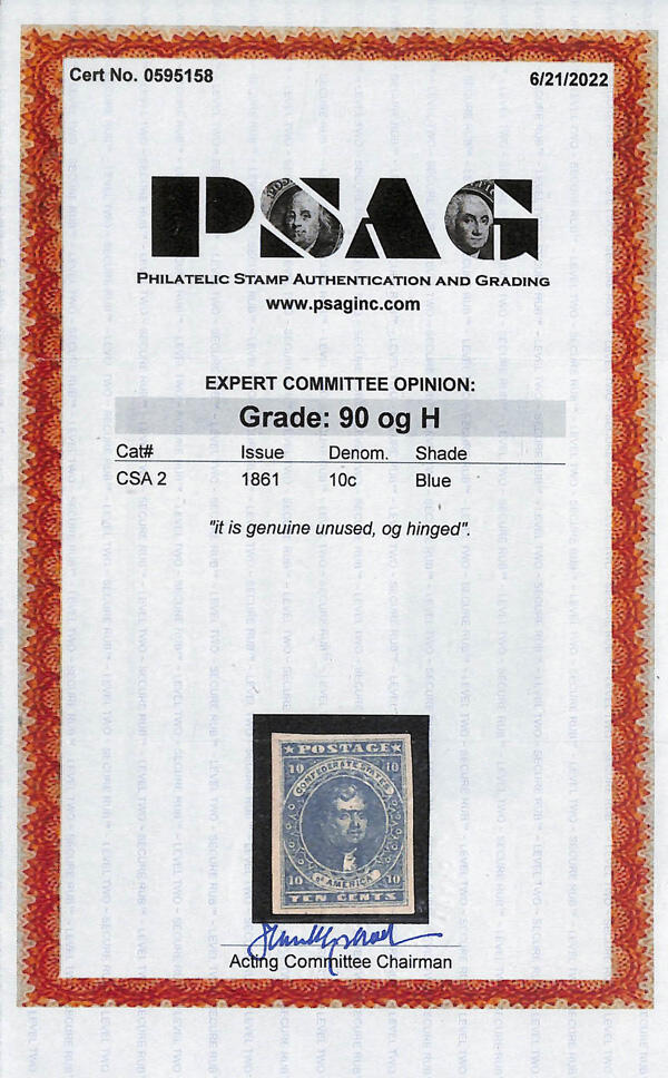| Zusatzinformationen und Suchstichworte: | Kelleher 774. Auktion 13. - 16. September 2022 1861,10¢ blau (Scott 2), Originalgummi gefalzt, postfrisch mit sauber Prägung und vier große, gleichmäßig gerandet, Kabinett, mit 2022 P. S. A. G. Attest eingestuft Kabinett 90. SMQ Kabinett 90; $600. Scott $275. Ausruf 250,00 USD |