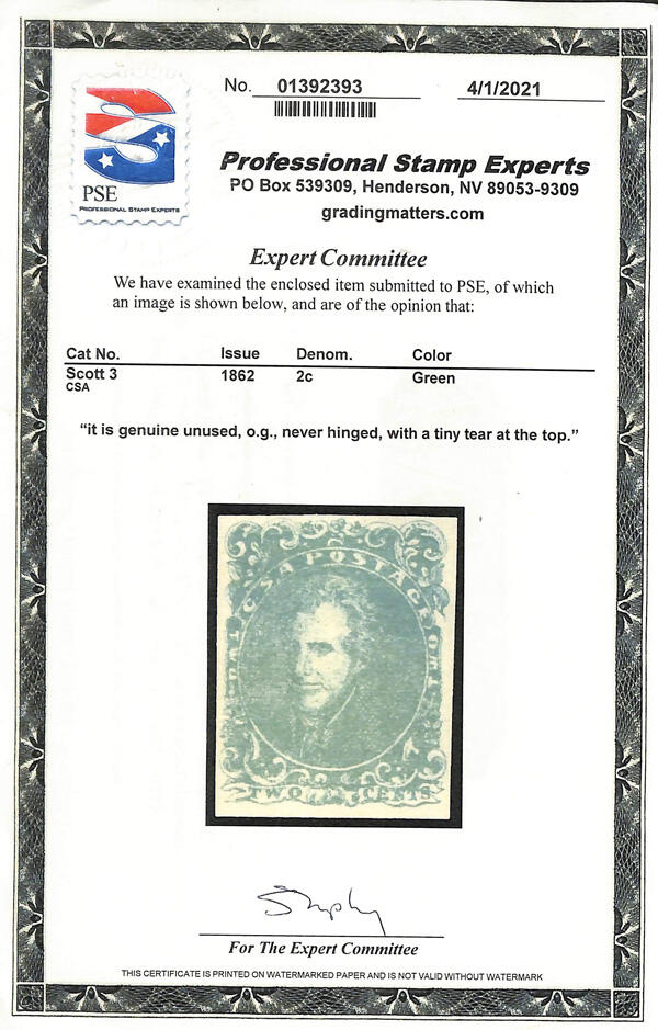 | Zusatzinformationen und Suchstichworte: | Kelleher 774. Auktion 13. - 16. September 2022 Los 4151 Konföderierte Staaten 1862,2¢ grün (Scott 3), Originalgummi postfrisch, sauber Prägung mit attraktive Farbe, alle Ränder klare obwohl nähere auf der linken Seite und oben; winziger Einriss oben, ansonsten feinst bis Pracht, mit 2021 P. S. E. Attest. Scott $950 für gefalzt. Ausruf 250,00 USD |