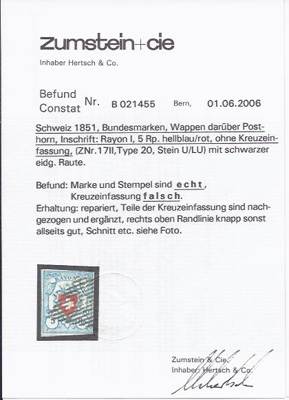 | Zusatzinformationen und Suchstichworte: | Siehe auch erstes Attest http://www.briefmarken-atteste.de/atteste/zeigen/1303 Hier wird die nachgemalte Kreuzeinfassung erwaehnt. Marke ist als 'repariert' beschrieben. |