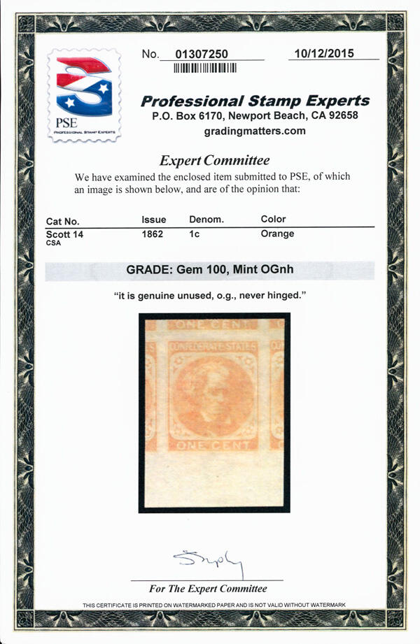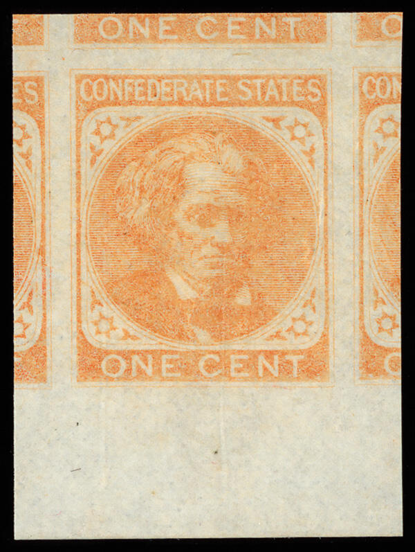 | Zusatzinformationen und Suchstichworte: | Kelleher Auktion 2002. - The Kelleher Club Sale 18. - 20. Oktober 2022 Los 2146 Konföderierte Staaten 1862,1¢ orange, nicht ausgegeben (Scott 14), Unterrand einzeln, Originalgummi postfrisch, postfrisch und ganz gummiert, schauend wie es kam entfernt die Presse gestern; eingerahmt bei Teile von fünf daneben gesetzt Briefmarken, ein Pracht Schmuckstück, ein absolute Spitze, die höchsten Stufe bewertete in SMQ, mit 2015 P. S. E. Attest eingestuft Schmuckstück 100. SMQ Schmuckstück 100; $1,700. Scott $100 als Originalgummi Ausruf 375,00 USD |