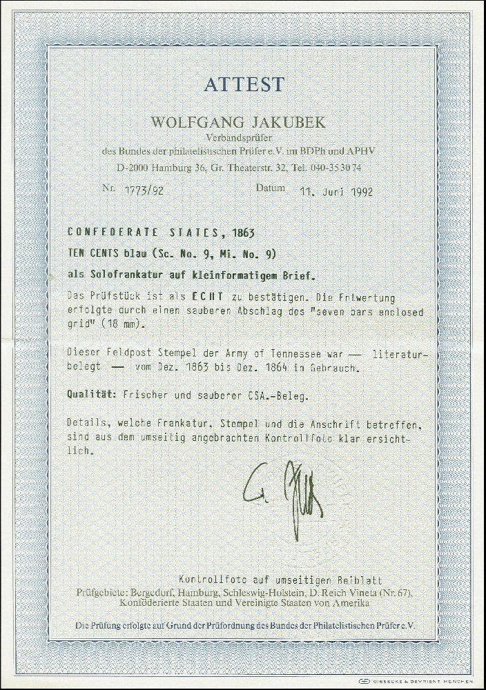 | Zusatzinformationen und Suchstichworte: | Heinrich Köhler 379. Auktion 19. - 24. September 2022 Los 1678 Konföderierte Staaten 1863, TEN CENTS blue, full to large margins, tied by seven bars enclosed grid of the army of Tennessee to cover to Alabama, vf, certificate Jakubek BPP (1992) (Scott 9) Zuschlag 450,00 EUR |