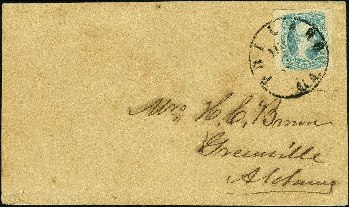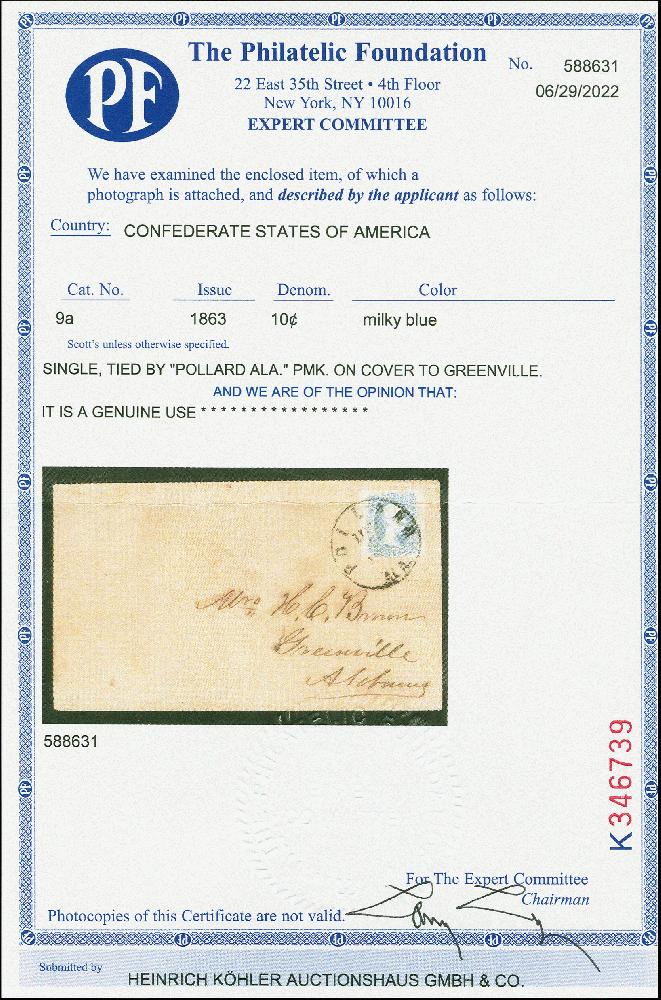 | Zusatzinformationen und Suchstichworte: | Heinrich Köhler 379. Auktion 19. - 24. September 2022 Los 1679 Konföderierte Staaten 1863, TEN CENTS milky blue, full to large margins, tied by cds. "POLLARD ALA. DEC....." to cover to Greenville, vf, certificate PF (2022)) (Scott 9a) Zuschlag 900,00 EUR |