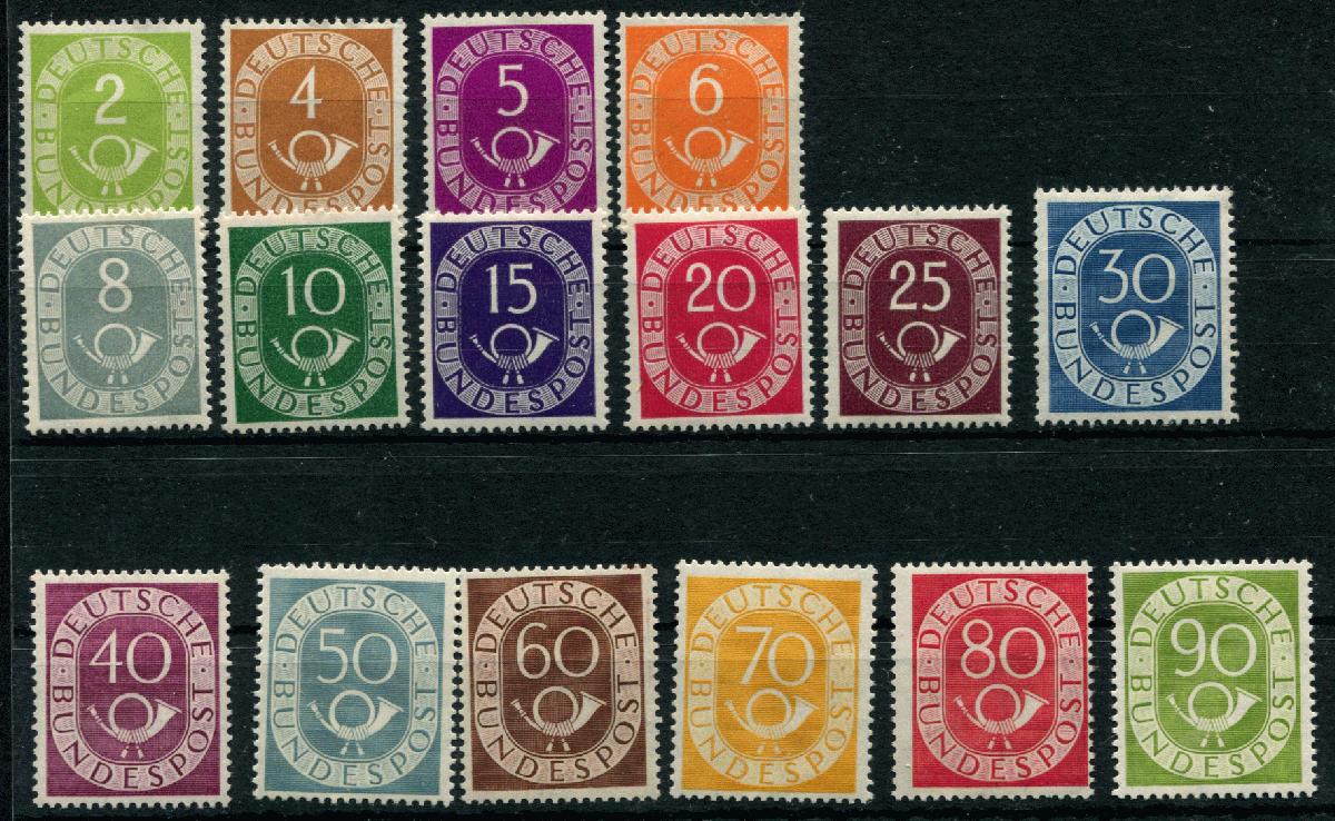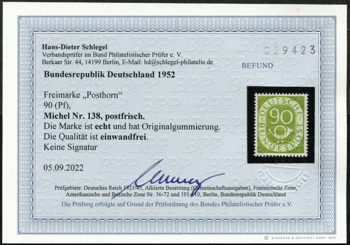 | Zusatzinformationen und Suchstichworte: | 109. Briefmarken Lenz Auktion 31. Oktober - 3. November 2022 Los 7073 Bundesrepublik Deutschland 1951, Posthorn, kpl. Satz, 30 Pf. mit kleinem Mangel, 90 Pf. mit Befund Schlegel Echt und Einwandfrei, sonst alle geprüft Schlegel, ca. Mi.2.200,- Ausruf 400,00 EUR |