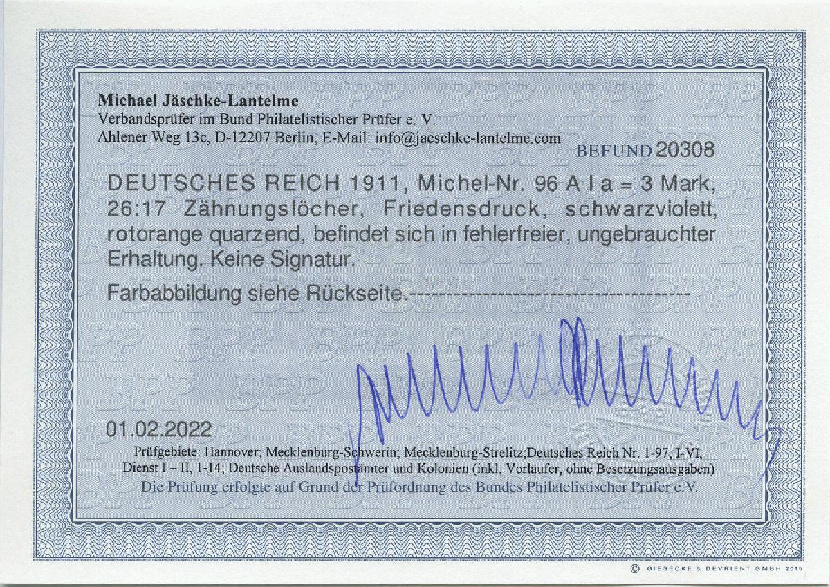 | Prüfer: | Jäschke-Lantelme, Michael (BPP (Bund Philatelistischer Prüfer)) |