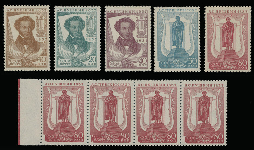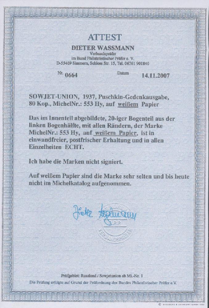 | Zusatzinformationen und Suchstichworte: | Raritan Stamps - 94. Auktion 26. - 29. Oktober 2022 Los 1255 Sowjetunion 1937, Alexander Pushkin, 10k-80k, kompletter Satz mit fünf, Kammzähnung 12¼x 11¾, gedruckt auf gewöhnliches gelbliches Papier, zuzüglich 80k in links Bogenrand waagrechter Viererstreifen, gedruckt auf weiß gewöhnliches Papier, alle mit vollem Originalgummi, postfrisch, Pracht, Exemplar D. Wassman Attest für 80k auf weißem Papier in Block von 25, Schätzpreis. $250-$300 Zuschlag 220,00 USD |