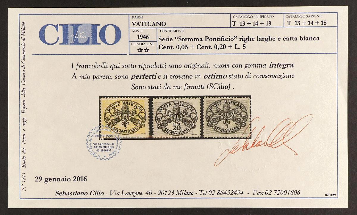 | Zusatzinformationen und Suchstichworte: | Cheshire Stamp Auction - #8337 - Public Auction 10. September 2022 Los 475 VatikanstaatNachgebühr 1946 Satzes, Sassone 13/18, postfrisch ungebraucht. Mit Cilio Attest für beste drei Werte und signiert von ihn. Katalog € 850. (6) Ausruf 85,00 GBP |