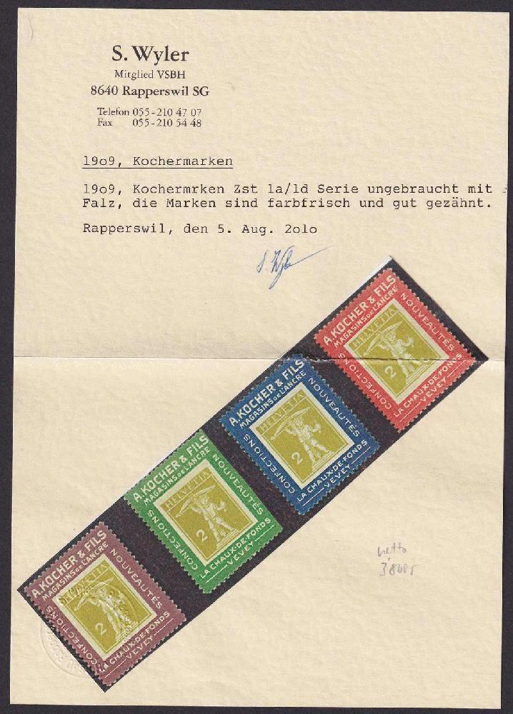 | Zusatzinformationen und Suchstichworte: | 6. Schwarzentruber Auktion 16. - 18. Dezember 2022 Los 3195 Schweiz 1a-1d, Kochermarken (4) kompletter, ungebrauchter Satz ohne Gummi, Attest Wyler, SBK: 4'800.- Ausruf 1.500,00 CHF |