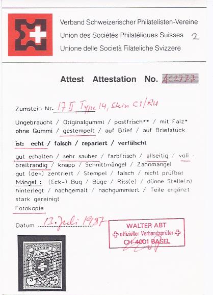 | Prüfer: | Abt, Walter (SBPV / ASEP (Schweizerischer Briefmarken-Prüfer-Verband)) |
