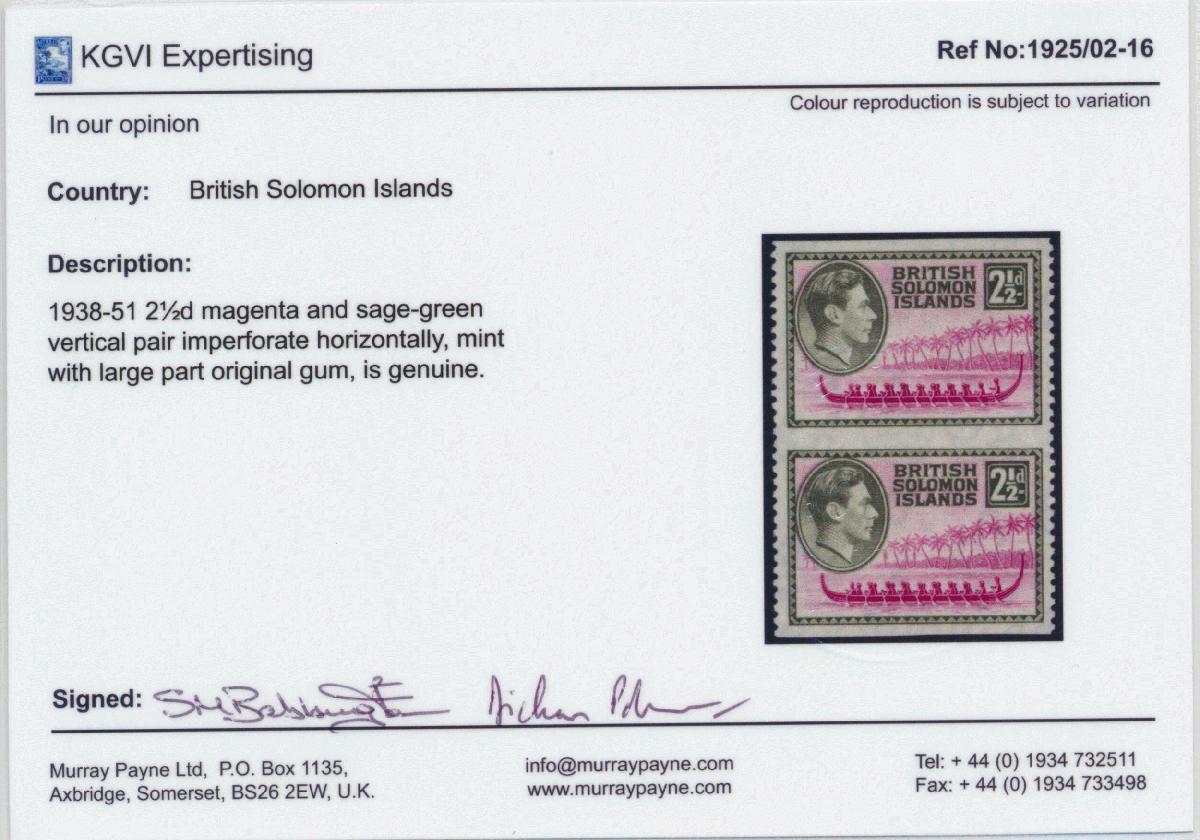 | Zusatzinformationen und Suchstichworte: | Doreen Royan & Associates Shop - Online Los 751650 Britische Salomonen 1939-1951 König Georg VI. 21/2d. Magenta und Salbeigrün. Sorte, "horizontal imperforieren (vertikal) Paar)". Hervorragender, extrem leicht montierter neuwertiger Zustand. KGVI Prüfzertifikat Nr. 1925/02-16 (2016). DIES IST EINE DER DIE WICHTIGSTEN SORTEN AUS DER REGIERUNGSZEIT VON KÖNIG GEORG VI. HERAUSRAGEND UND ÄUSSERST SELTEN. Preis auf Anfrage |