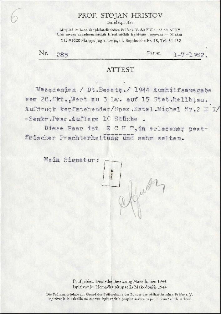 | Prüfer: | Hristov, Stojan (BPP (Bund Philatelistischer Prüfer)) |