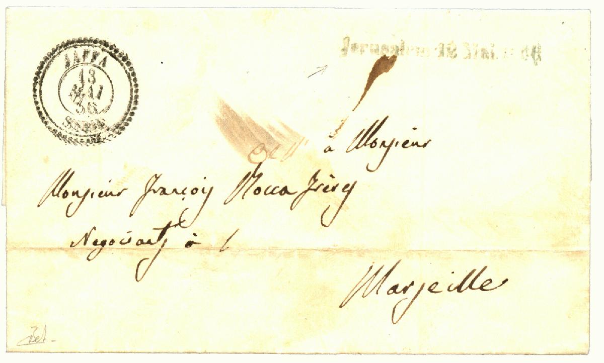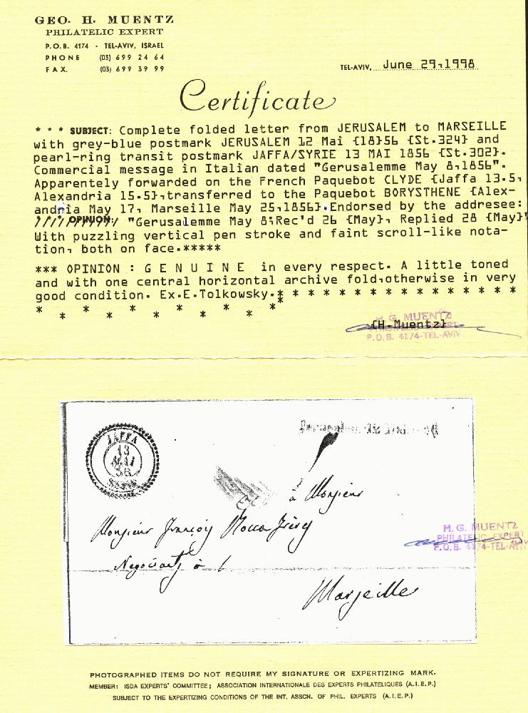 | Zusatzinformationen und Suchstichworte: | Lugdunum 123. Auktion 5. Dezember 2022 Los 474 Französische Post in der Levante 1856 Cachet linéaire bleu JERUSALEM 12 mai 1856 + JAFFA SYRIE sur lettre avec texte (en ITALIEN) pour MARSEILLE. Trés rare. Certificat MUENTZ (1998). TTB Ausruf 1.500,00 EUR |
