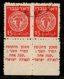 | Zusatzinformationen und Suchstichworte: | Romano Fernauktion No. 44 30. November 2022 Los 148 Israel Doar Ivri Ausgabe FIRST ISRAEL COINAGE STAMPS (DOAR IVRI 1948) Bale: 4e. 15m perforated 10 3/4, horizontal pair with tabs used in time in HAIFA. Certificate by MUENTZ. Cat $600. Ausruf 100,00 USD |