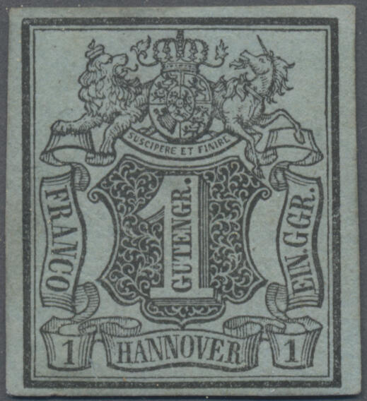 | Zusatzinformationen und Suchstichworte: | Christoph Gärtner 54. Auktion 18. - 19. Oktober 2022 Los 4641 D Altdeutschland Hannover 1850, 1 Ggr. schwarz auf blaugrau, farbfrisches und allseits vollrandiges Exemplar, ungebraucht mit Originalgummi (etwas verlaufen und minime ergänzte Stelle), unten kl. punkthelle Stelle (außerhalb des Markenbildes und somit belanglos), signiert Richter sowie weiteres kreisrundes Signum. Fotoattest Jäschke-Lantelme BPP. Eine in ungebrauchter Erhaltung seltene und immer fehlende Marke! Zuschlag 1.300,00 EUR |