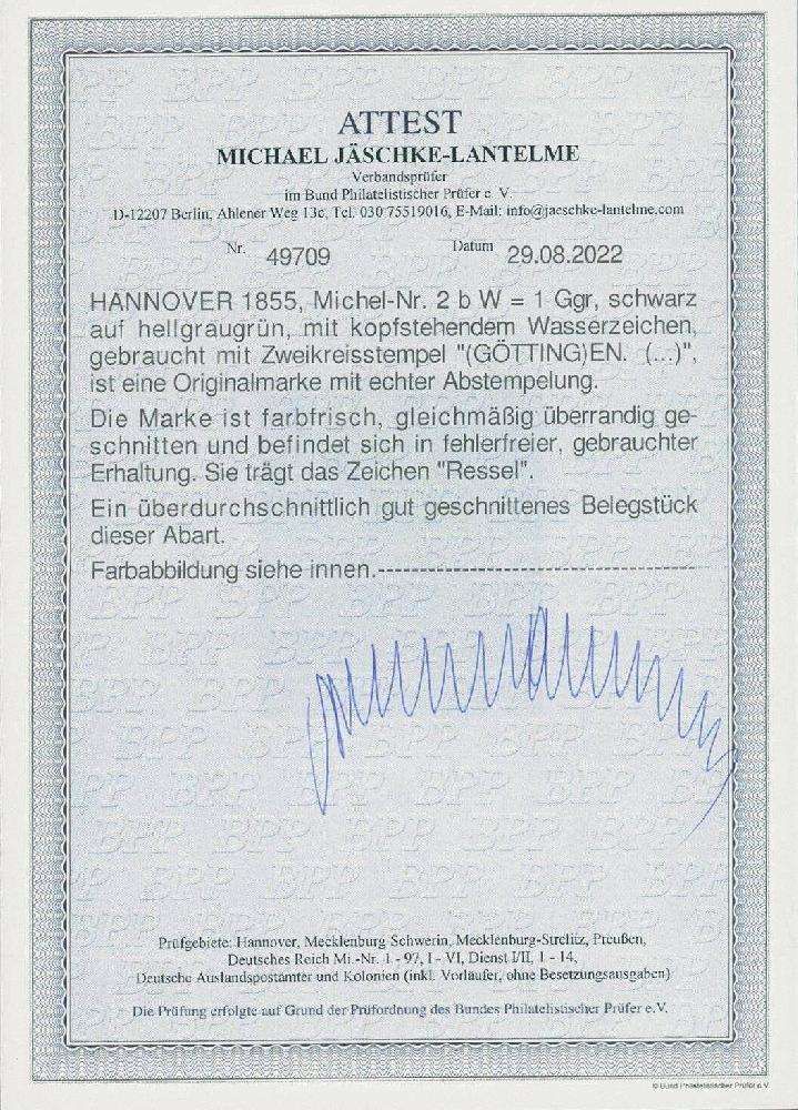 | Zusatzinformationen und Suchstichworte: | Ulrich Felzmann 176. Auktion 15. - 19. November 2022 Los 5045 Altdeutschland Hannover 1 Ggr auf meergrün mit kopfstehendem Wasserzeichen, farbfrisch und ringsum gleichmäßig überrandig (!) mit sauberem Teilstempel von Göttingen in fehlerfreier, besonders attraktiver Kabinetterhaltung, sign. Ressel sowie Fotoattest Jäschke-L. BPP "Ein überdurchschnittlich gut geschnittenes Belegstück dieser Abart", € 750,- Ausruf 300,00 EUR |