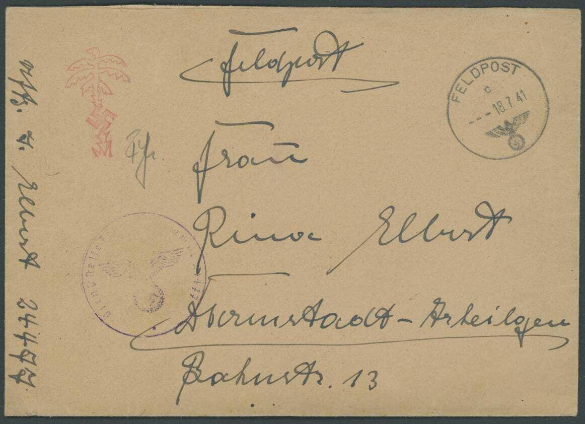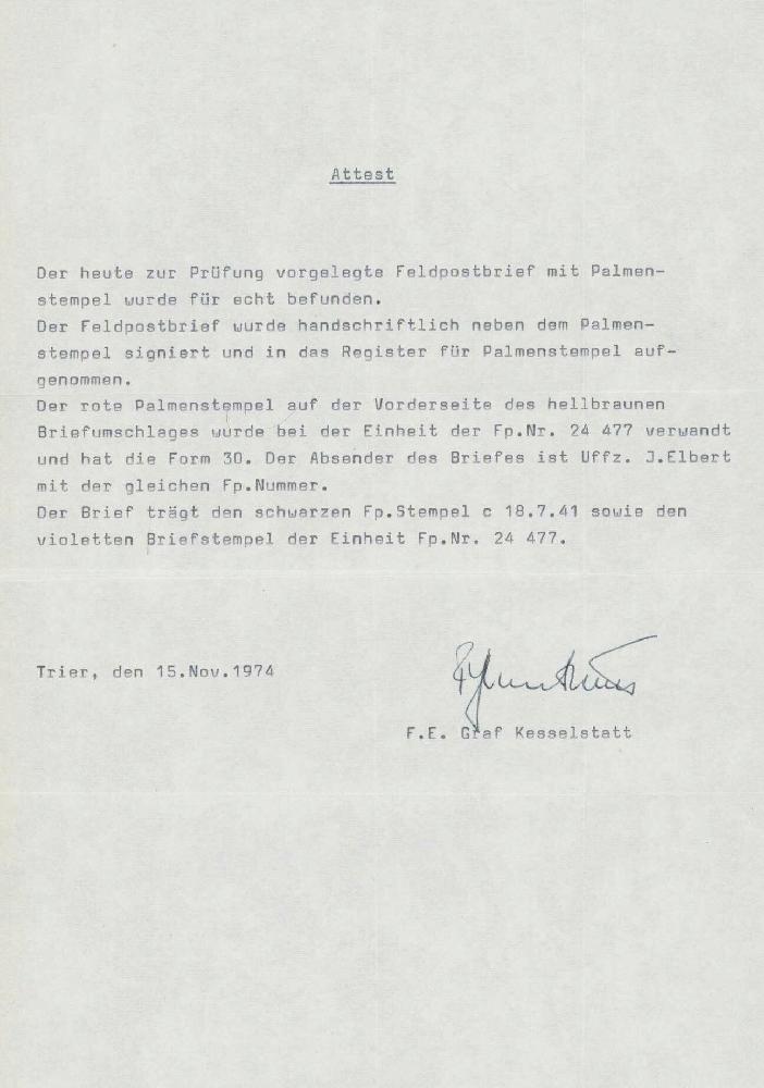 | Zusatzinformationen und Suchstichworte: | Ulrich Felzmann 176. Auktion 15. - 19. November 2022 Los 5711 Feldpost II Wk PALMENSTEMPEL in Form 30 in roter Farbe vs. auf Brief mit Fp-Nr. 24477 (Kolonne Panz. Aufkl. Abt. 15) mit Normstempel "c" 18.7.41 nach Darmstadt Arheiligen, Briefstempel vs., Verwendung wenige Tage nach Einführung dieser Stempelform, Attest Kesselstatt Ausruf 200,00 EUR |