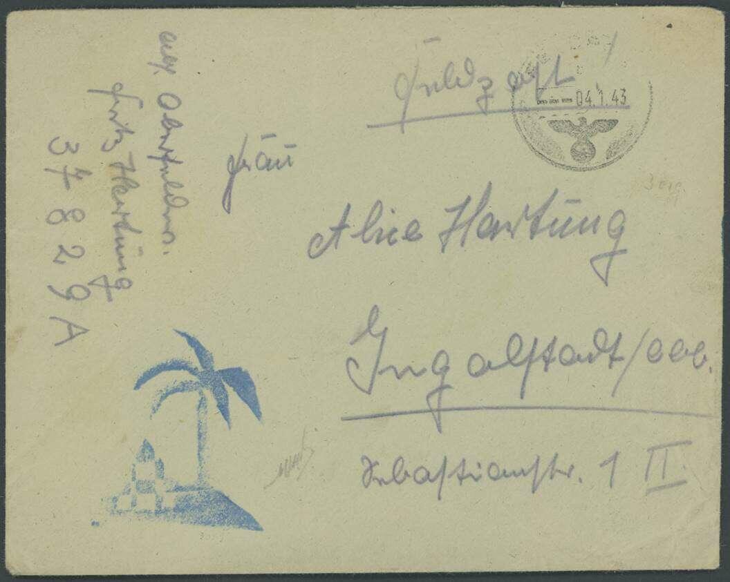 | Zusatzinformationen und Suchstichworte: | Ulrich Felzmann 176. Auktion 15. - 19. November 2022 Los 5717 Feldpost II Wk PALMENSTEMPEL in Form 56 und blauer Farbe auf Brief mit Fp-Nr. 37829 A (Stab Panz. Aufkl. Abt. 21) und Normstempel "b" 4.1.43 nach Ingolstadt, gute Bedarfserhaltung, signiert mit Attest Kesselstatt Ausruf 200,00 EUR |