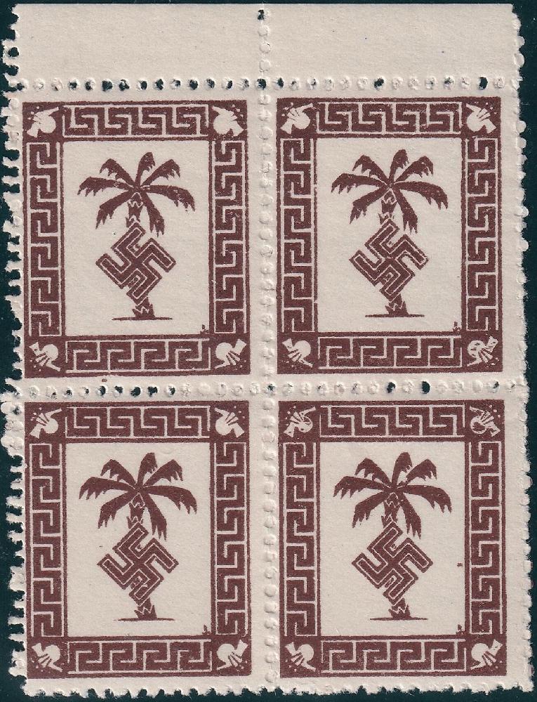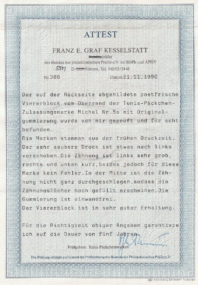 | Zusatzinformationen und Suchstichworte: | Tex Design, 1. Sonderpreisliste Los 150 Deutsche Besetzung II. WK, Feldpostmarken TUNIS Feldpostpäckchen Zulassungsmarke, im 4er-Block, mit originaler Gummierung, einwandfrei pfr.; Attest Graf Kesselstatt, Kat. Nr. 5a, oberes Randstück, sehr selten in dieser Erhaltung angeboten Festpreis 1.800,00 EUR |