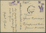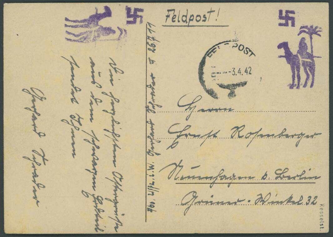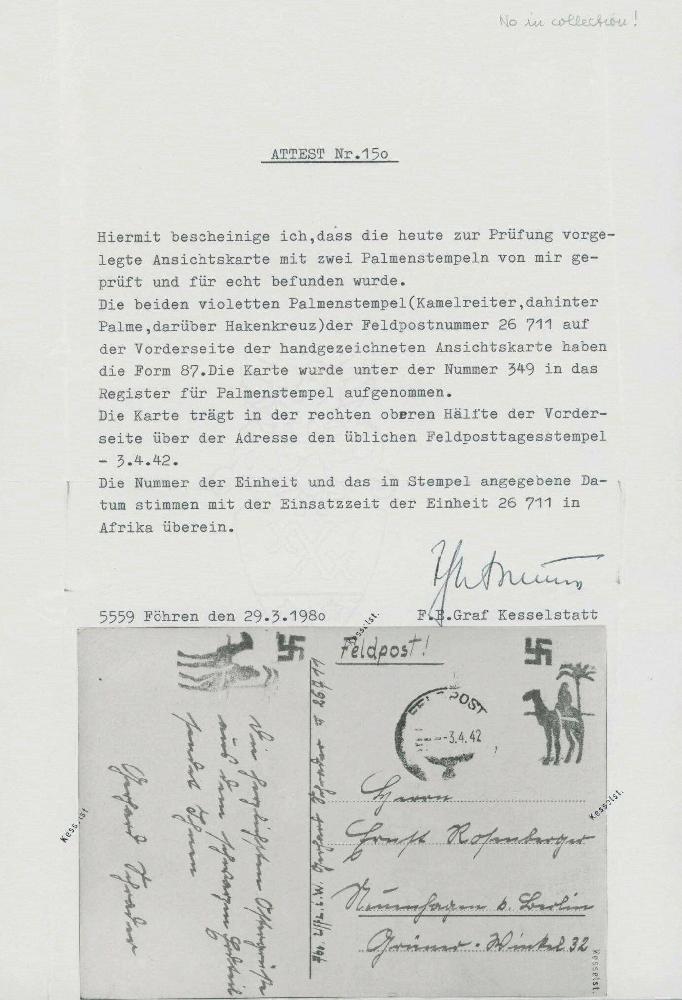 | Zusatzinformationen und Suchstichworte: | Ulrich Felzmann 176. Auktion 15. - 19. November 2022 Los 5723 Feldpost II Wk PALMENSTEMPEL mit erst in den Nachträgen gelisteter Form 87 in blauvioletter Farbe und ungewöhnlichem Motiv mit Kamelreiter im Vordergrund, zwei mal vs. auf Karte mit Fp-Nr. 26711 A (Stab Pionier Btl. 900) und Normstempel 3.4.42 nach Neuenhagen bei Berlin, rs. handgezeichnete Karikatur eines nach Bier dürstenden Soldaten in der Wüste, Signatur und Foto-Expertise Kesselstatt Ausruf 250,00 EUR |