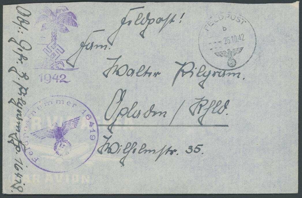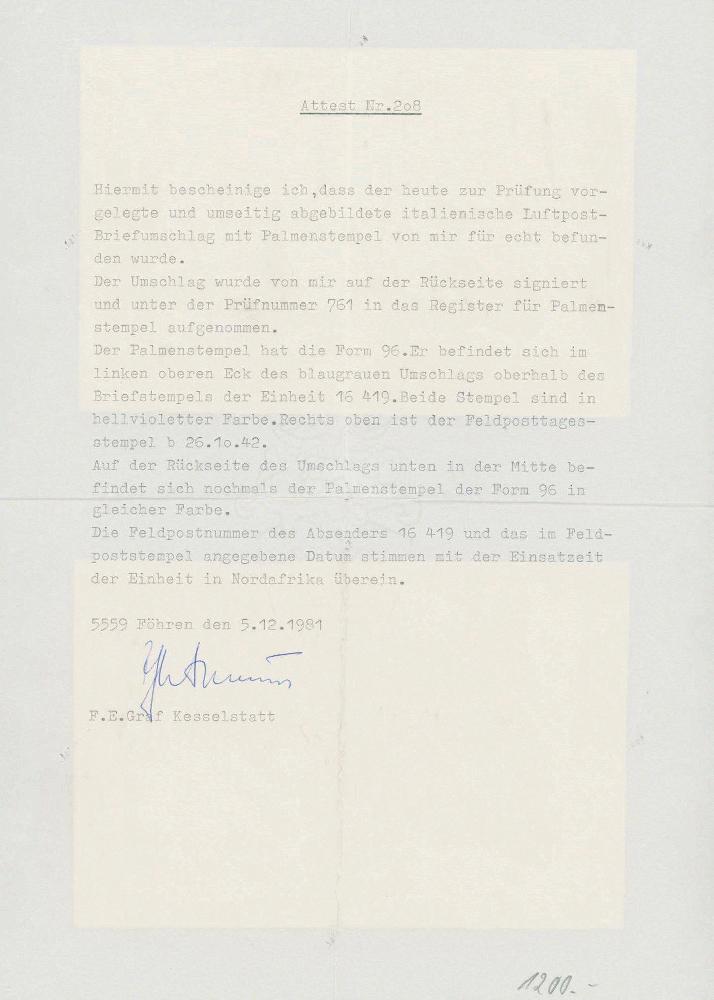 | Zusatzinformationen und Suchstichworte: | Ulrich Felzmann 176. Auktion 15. - 19. November 2022 Los 5724 Feldpost II Wk PALMENSTEMPEL mit erst in den Nachträgen registrierter Form 96 mit Jahreszahl "1942" unter der Palme, beidseitig in violetter Farbe auf Brief mit Fp-Nr. 16419 (Stab Nachsch. Kol. Abt. 572, Kraftw. Werkst. Zug 572) und Normstempel "b" 26.10.42 nach Opladen im Rheinland, Briefstempel vs., sehr gute Erhaltung, signiert und Fotoattest Kesselstatt Ausruf 200,00 EUR |