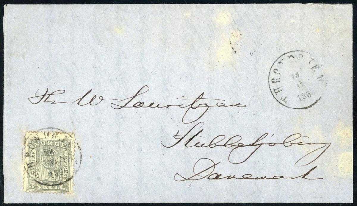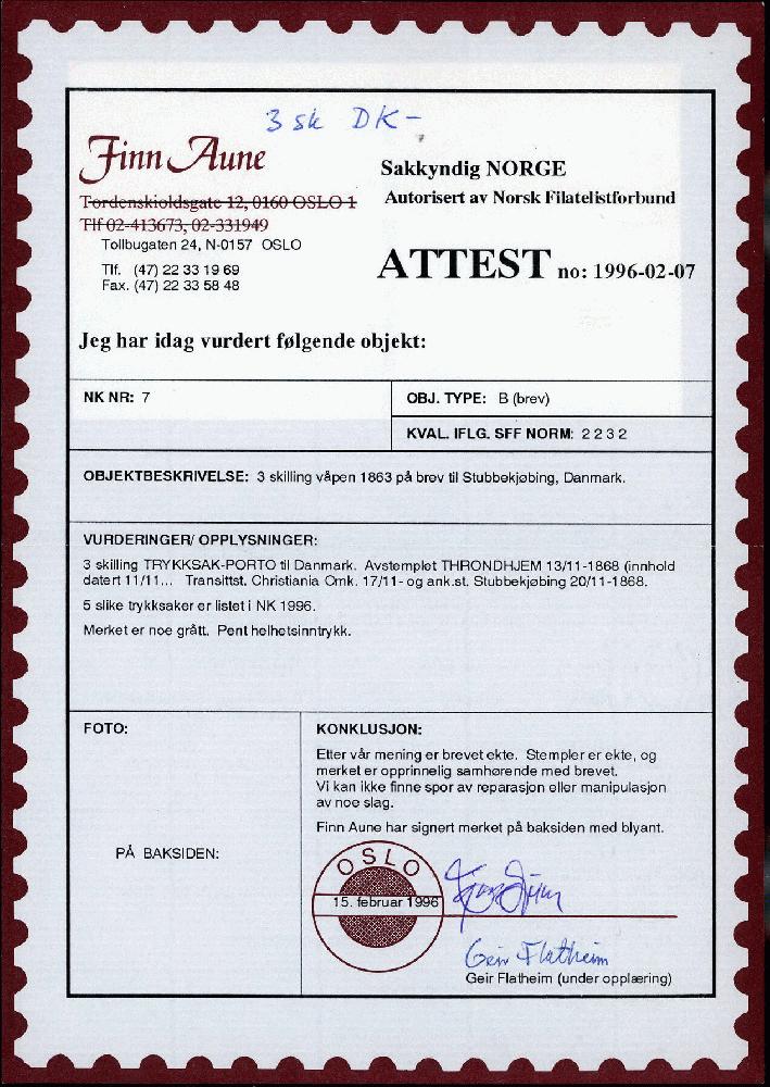 | Zusatzinformationen und Suchstichworte: | Skanfil Auktion - Herbst Auktion 2022 9. - 12. November 2022 Los 3629 Norwegen Wappen 1863 7. Enkeltmerke i noe grå nyanse på komplett trykksak stemplet "THRONDHJEM 13.11.1863" sendt til Stubbekøbing, Danmark. Attester L.Nielsen og Finn Aune, sistnevnte kommenterer på nyansen med omtaler som "pent helhetsinntrykk". Transittstempler bak. (Postal 12000) Ausruf 4.000,00 NOK |