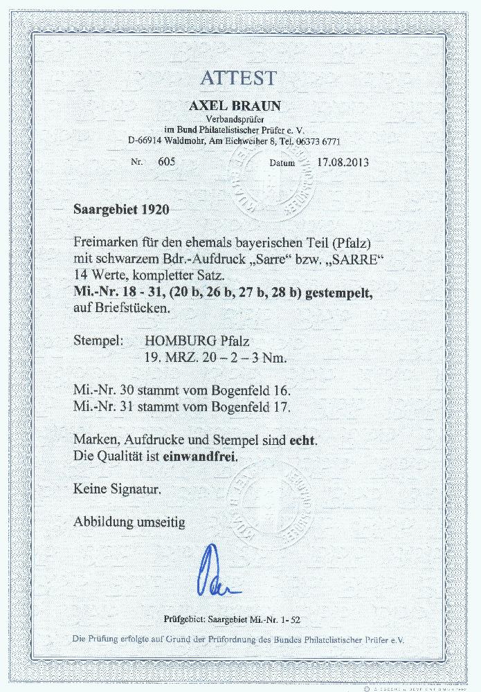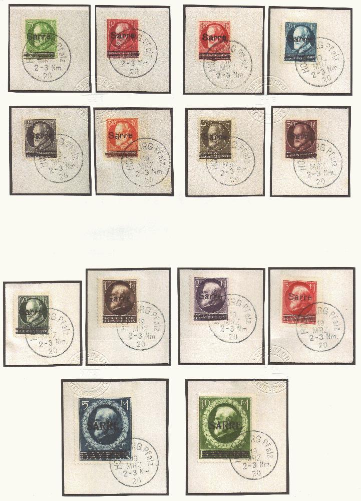 | Zusatzinformationen und Suchstichworte: | Freimarken für den ehemals beyerischen Teil (Pfalz) mit schwarzem Bdr.-Aufdruck "Sarre" bzw. "SARRE", 14 Werte, kompletter Satz, Mi.-Nr. 18-31 (20 b, 26 b, 27 b, 28 b), gestempelt, auf Briefstücken |