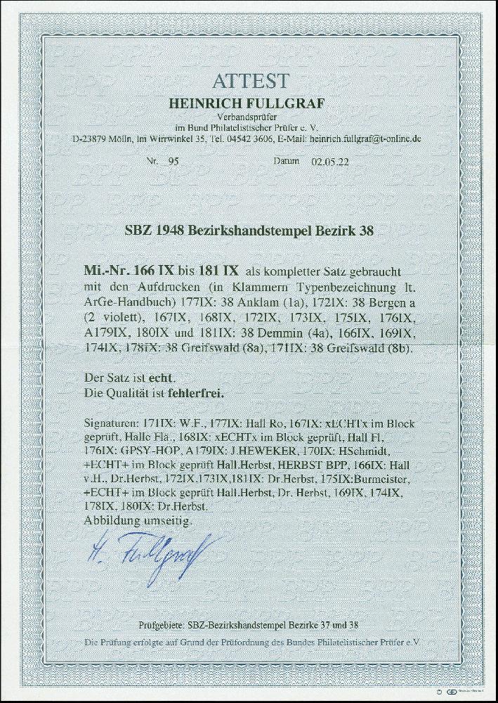 | Prüfgebiet: | Alliierte Besetzung SBZ Bezirkshandstempel Bezirk 38 |