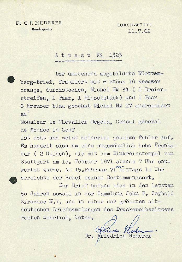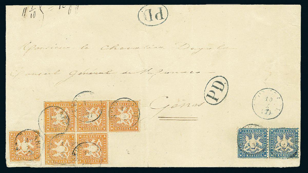 | Zusatzinformationen und Suchstichworte: | Dr. Derichs 166. Auktion - TROST V - Königreich Württemberg 22. Oktober 2022 Los 1584 Altdeutschland Württemberg \120-KREUZER-FRANKATUR AUF BRIEF NACH ITALIEN\: 18 Kreuzer orangegelb im senkrechten Dreierstreifen, senkrechten Paar und als Einzelstück in Mischfrankatur mit waagerechtem Paar 6 Kreuzer blau der vorherigen Markenausgabe auf großformatigem kartonartigen Brief mit K1 "Stuttgart 10/2" (1871) nach Genua/Italien. Die Marken teils mit verwendungsbedingten Unebenheiten, jedoch nicht repariert und völlig ursprünglich auf dem oben etwas verkürztem Kuvert haftend. Tarifrichtige Frankatur für die zwölfte Gewichtsstufe, links oben mit Gewichtsangabe "11 7/10 Loth", nebengesetzt zweimal der schwarze "PD."-Stempel mt ovaler Einfassung. Fotoattest Dr. Hederer BPP, Fotoattest Thoma BPP und neues Fotoattest Heinrich BPP: "Das vorliegende, einmalige Stück, zeigt die mit Abstand höchste bekannte Frankatur der späteren Kreuzerzeit (auf Brief, nicht auf Paketkarte) und ist für die Württemberg-Philatelie von außerordentlicher Bedeutung!". Der Brief entstammt der Korrespondenz des Stuttgarter Konsulats des Fürstentums Monaco und ist adressiert an den Generalkonsul des Fürstentums in Genua. Interessanterweise konnten wir mit Los 482 einen weiteren Brief aus dieser Korrespondenz mit einer 20-Kreuzer-Frankatur versteigern. Dieser Brief ist zugleich ein Beweis dafür, daß es eine Notwendigkeit von 70-Kreuzer-Marken für die Verwendung auf Auslandsbriefen gab. Die 70 Kreuzer erschien aber erst knapp zwei Jahre nach dem Stempeldatum dieses Briefes. Pedigree: Aus der Sammlung Gaston Nehrlich, Gotha; aus der Sammlung John F. Seybold, Syracouse, USA; aus der Sammlung des Conte Contini, Florenz. Zuschlag 30.000,00 EUR |