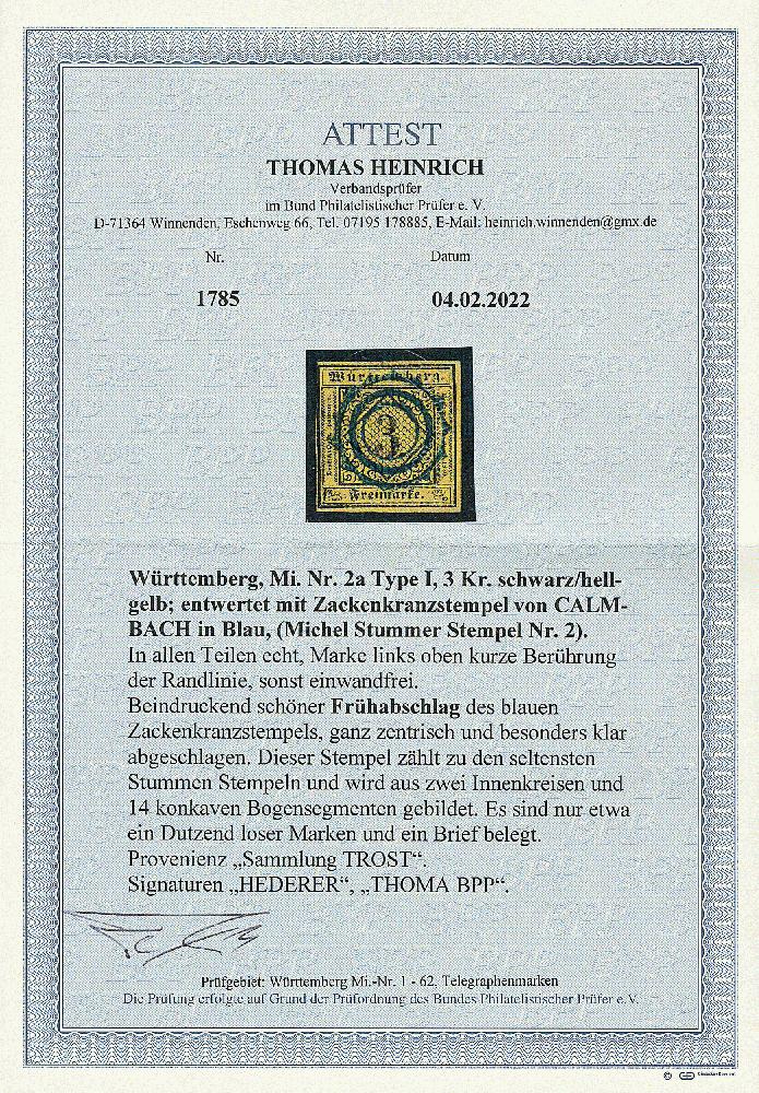 | Zusatzinformationen und Suchstichworte: | Dr. Derichs 166. Auktion - TROST V - Königreich Württemberg 22. Oktober 2022 Los 1679 Altdeutschland Württemberg \CALMBACH\: Zahnradzweikreisstempel (Stempel-Katalognummer 2) in Blau ideal gemittet auf 3 Kreuzer schwarz auf gelb (Type "I"). Die Marke ist links oben ganz minimal an die Kante geschnitten und soweit tadellos. Dieser Stempel zählt zu den seltensten Stummen Stempeln und wird aus zwei Innenkreisen und 14 konkaven Bogensegmenten gebildet. Gutachten Carl Köhler (1934), Fotoattest Dr. Hederer BPP (1970), Fotoattest Thoma BPP (1984) und neues Fotoattest Heinrich BPP: "Beeindruckend schöner Frühabschlag... Es sind nur etwa ein Dutzend loser Marken und ein Brief belegt.". (Michel 12.000.-). Anmerkung: Den einzigen bekannten Brief konnten wir unter Losnummer 241 mit 120.000 Euro zuschlagen. Das ist der bis zum Zeitpunkt der Formulierung dieses Losbeschriebes gültige Weltrekord für einen Württemberg-Stempel Zuschlag 9.000,00 EUR |