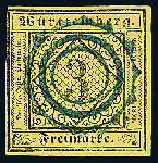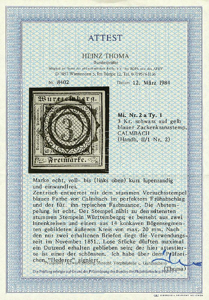 | Zusatzinformationen und Suchstichworte: | Dr. Derichs 166. Auktion - TROST V - Königreich Württemberg 22. Oktober 2022 Los 1679 Altdeutschland Württemberg \CALMBACH\: Zahnradzweikreisstempel (Stempel-Katalognummer 2) in Blau ideal gemittet auf 3 Kreuzer schwarz auf gelb (Type "I"). Die Marke ist links oben ganz minimal an die Kante geschnitten und soweit tadellos. Dieser Stempel zählt zu den seltensten Stummen Stempeln und wird aus zwei Innenkreisen und 14 konkaven Bogensegmenten gebildet. Gutachten Carl Köhler (1934), Fotoattest Dr. Hederer BPP (1970), Fotoattest Thoma BPP (1984) und neues Fotoattest Heinrich BPP: "Beeindruckend schöner Frühabschlag... Es sind nur etwa ein Dutzend loser Marken und ein Brief belegt.". (Michel 12.000.-). Anmerkung: Den einzigen bekannten Brief konnten wir unter Losnummer 241 mit 120.000 Euro zuschlagen. Das ist der bis zum Zeitpunkt der Formulierung dieses Losbeschriebes gültige Weltrekord für einen Württemberg-Stempel Zuschlag 9.000,00 EUR |