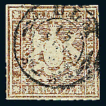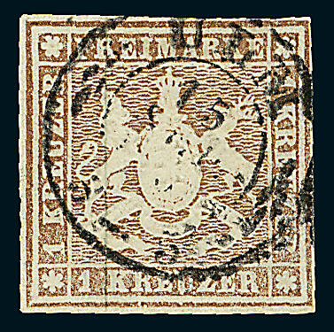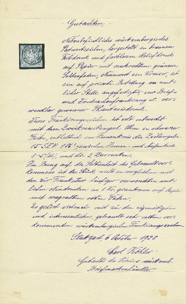 | Zusatzinformationen und Suchstichworte: | Dr. Derichs 166. Auktion - TROST V - Königreich Württemberg 22. Oktober 2022 Los 1516 Altdeutschland Württemberg \NEUDRUCK VON MAI 1865 - ECHT GEBRAUCHT\: 1 Kreuzer braun auf weißem dünnen Papier (0,07mm), vierseitig weißrandig mit K2 "Ulm 15 Sep." zentrisch und klar gestempelt. Luxus-Qualität. Die Neudrucke der III. Ausgabe, von der württembergischen Post amtlich hergestellt, kommen nahezu ausschließlich in ungebrauchter Erhaltung vor, waren aber frankaturgültig. Bei dieser Marke handelt es sich um ein UNIKAT. Gutachten Carl Köhler (1928), Fotoattest Thoma BPP (1978) und neues Fotoattest Heinrich BPP: "Echt und einwandfrei... Das einmalige Prüfstück stellt eine ganz außergewöhnliche Rarität der Württemberg-Philatelie dar!". (Im Michel gestempelt nur mit "-.-" verzeichnet). Zuschlag 5.000,00 EUR |