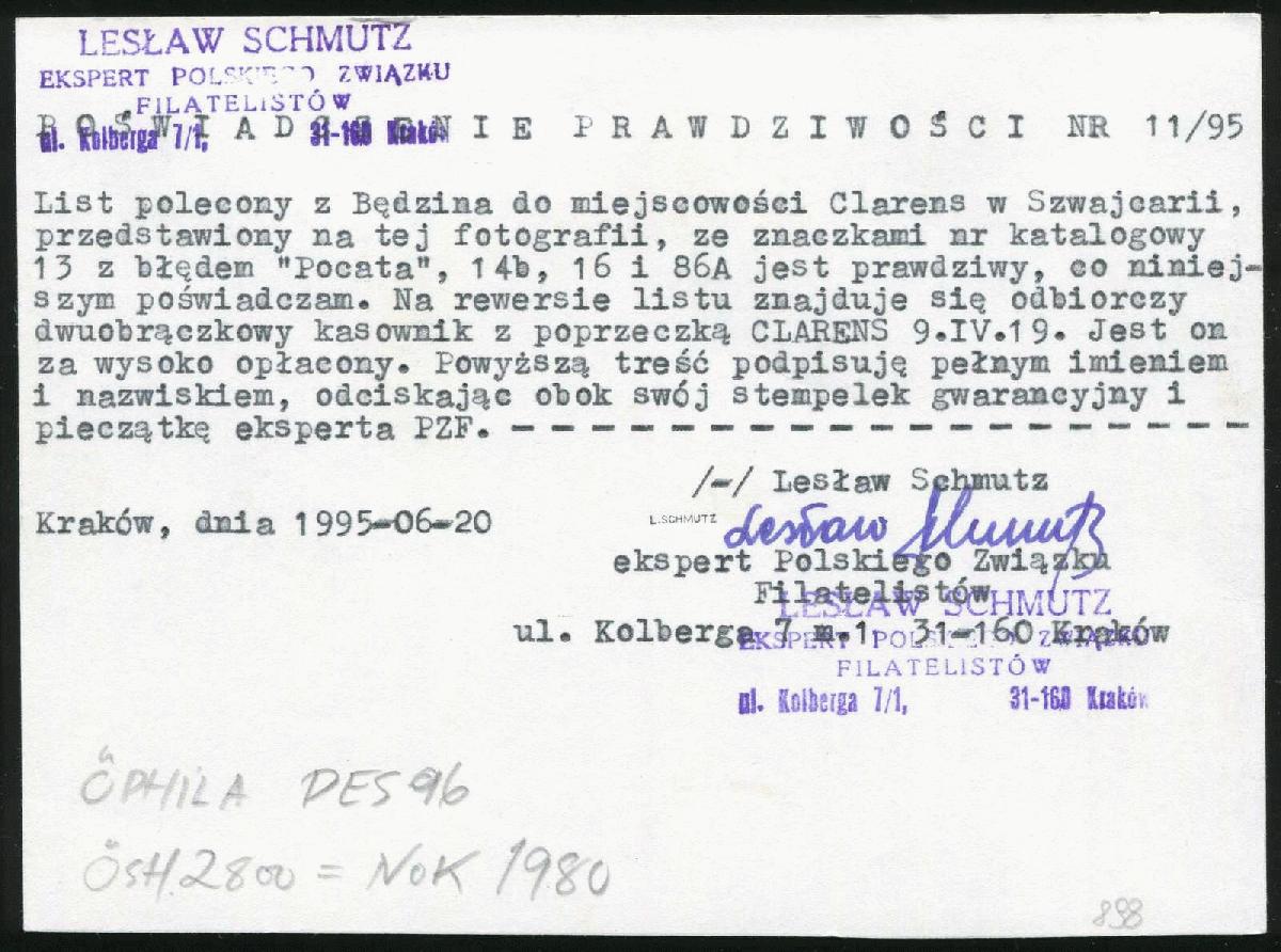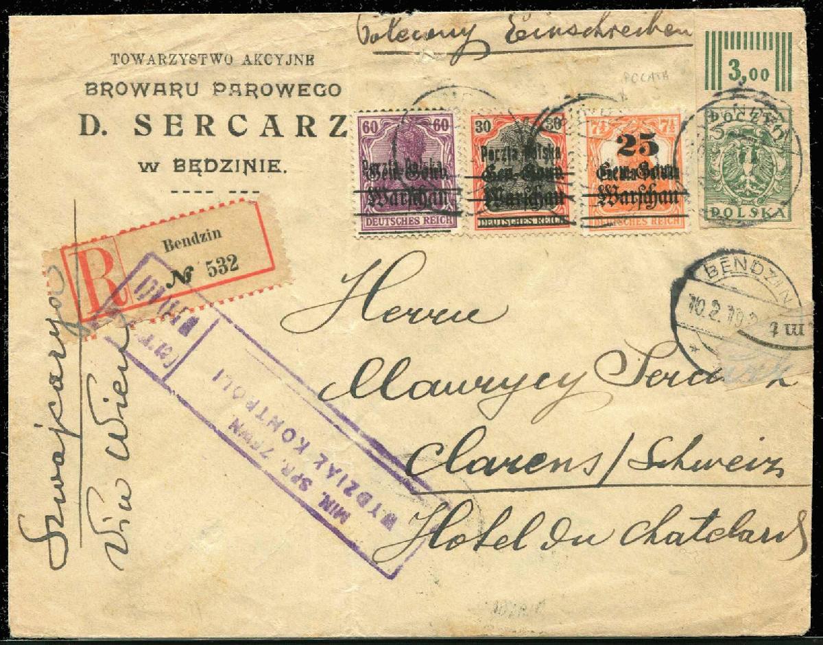 | Zusatzinformationen und Suchstichworte: | Loth 188. Auktion 28. Oktober 2022 Los 3021 Polen 25 auf 7 1/2 Pfg., mit Abart "Pocata statt Poczta", mit Zusatzfrankatur auf Zensur-R-Brief von Bendzin in die Schweiz, selten, Fotobefund Schmutz Zuschlag 100,00 EUR |