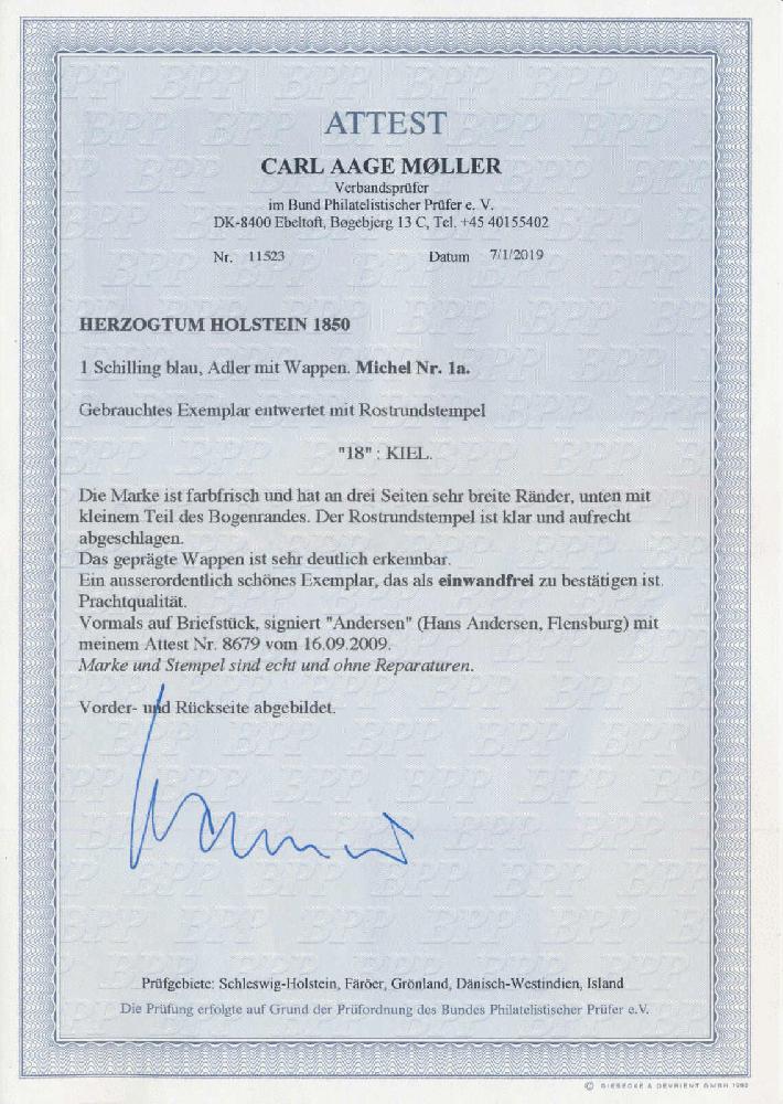 | Zusatzinformationen und Suchstichworte: | Postiljonen 237. Int. Briefmarken Auktion 29. September - 01. Oktober 2022 Los 162 Altdeutschland Schleswig Holstein Margin Copy 1 Schilling A fabulous copy with a beautiful numeral "18" KIEL. Part of sheet margin at bottom and three wide margins on the other sides. Very rare in such quality. Cert. Møller. SUPERB. Provenance: Carl Aage Møller Ausruf 4.000,00 EUR |