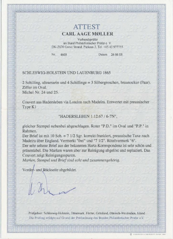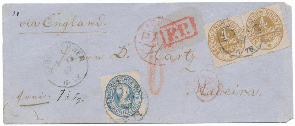 | Zusatzinformationen und Suchstichworte: | Postiljonen 237. Int. Briefmarken Auktion 29. September - 01. Oktober 2022 Los 176 Altdeutschland Schleswig Holstein Envelope with 2 schilling blue (coloured letters) and pair 4 schilling ochre from the well known "Harz-correspondence" sent from "HADERSLEBEN 1.12 67" via "LONDON" to Madeira. Red "P.P." and in oval "PD". Correctly franked (Prussian rate) with 10 schilling = 7 1/2 Silbergroschen (noted at bottom left). Light traces of cleaning. Cert. Møller. VERY FINE. Ausruf 1.200,00 EUR |