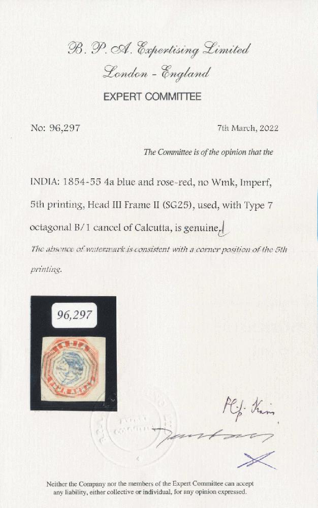 | Zusatzinformationen und Suchstichworte: | Postiljonen 237. Int. Briefmarken Auktion 29. September - 01. Oktober 2022 Los 209 Indien INDIA. A very beautiful copy of 4 a. blue and rose red without watermark that can only occur in the corner positions in the 5th printing. Very well placed Calcutta octagonal "B/1" canc. Three wide margins and clear at top. Cert. BPA. SG £ 5.000+. VERY RARE WITHOUT WATERMARK. Zuschlag 1.000,00 EUR |