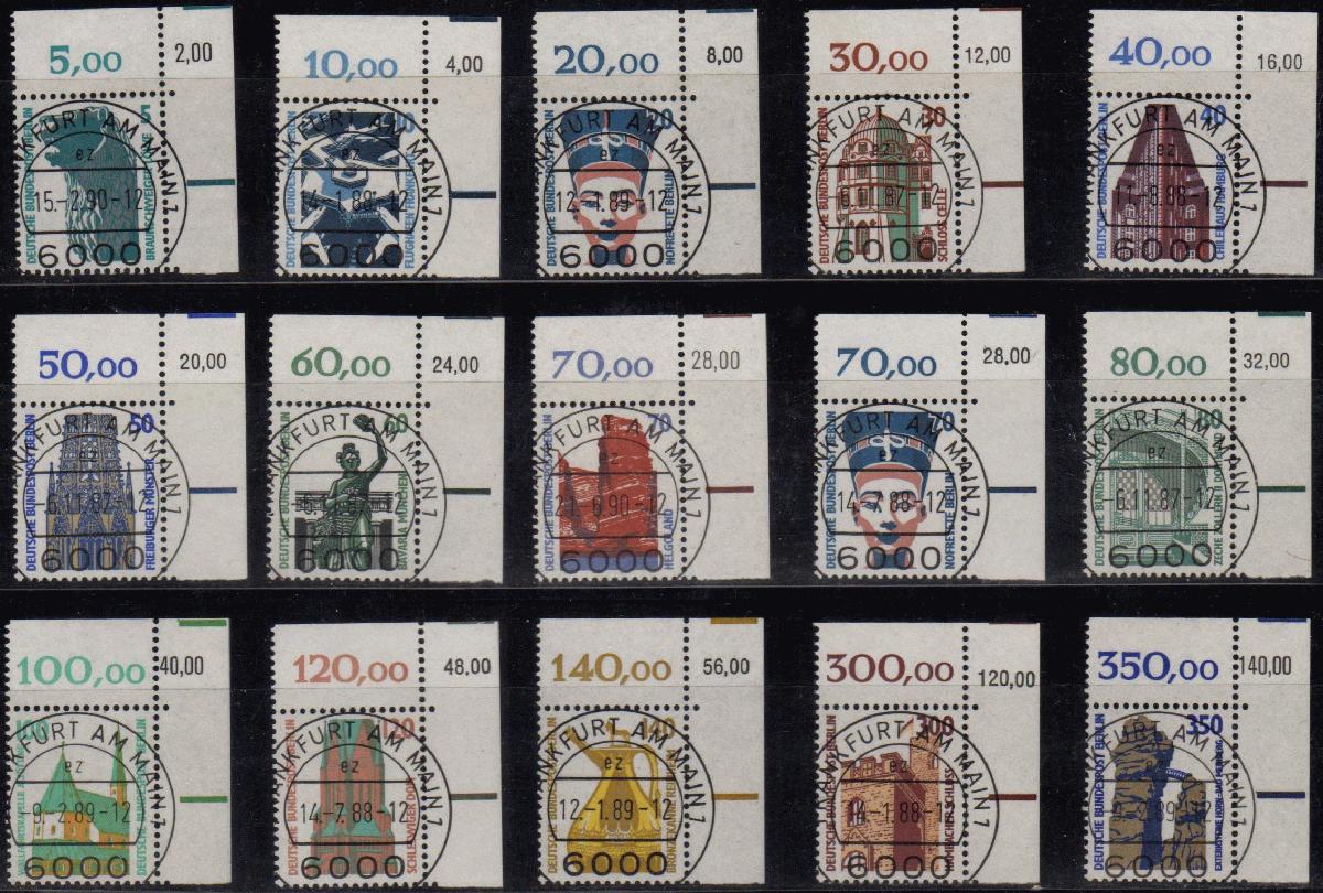 | Zusatzinformationen und Suchstichworte: | 109. Briefmarken Lenz Auktion 31. Oktober - 3. November 2022 Los 6753 Berlin Michel793 KBWZ u.a. 1987-90, kpl. Satz Sehenswürdigkeiten, 15 Werte, alles Eckrandstücke rechts oben, mit korrigiertem Bogenrandwertzudruck und Stpl. "Frankfurt", Attest Schlegel BPP "echt und einwandfrei" Ausruf 400,00 EUR |