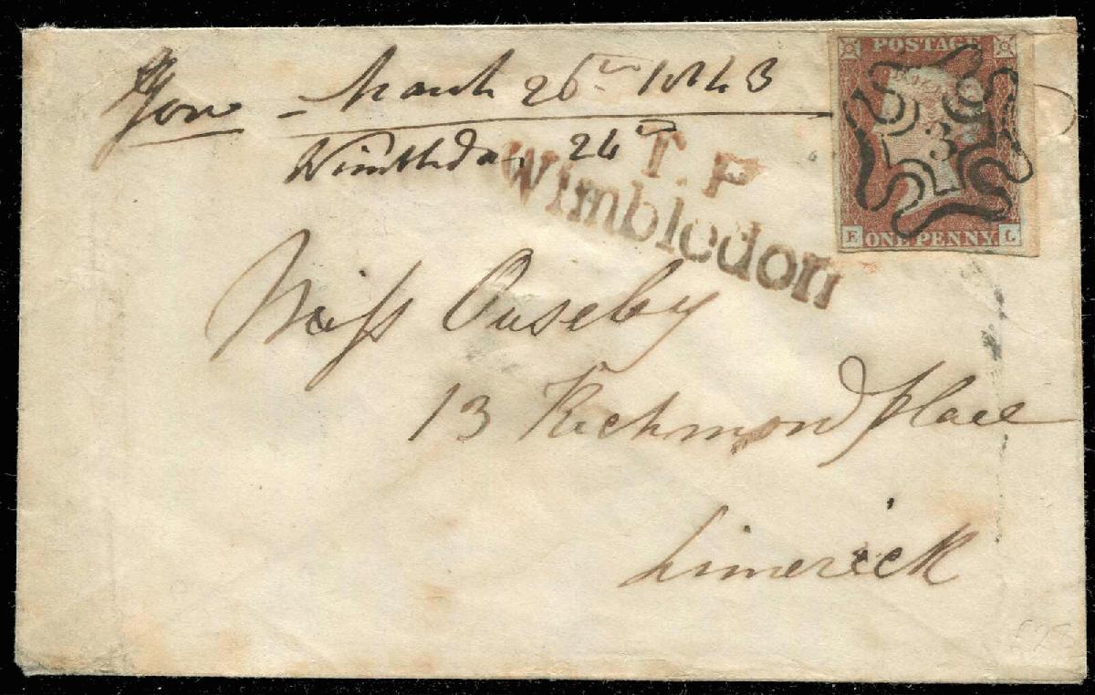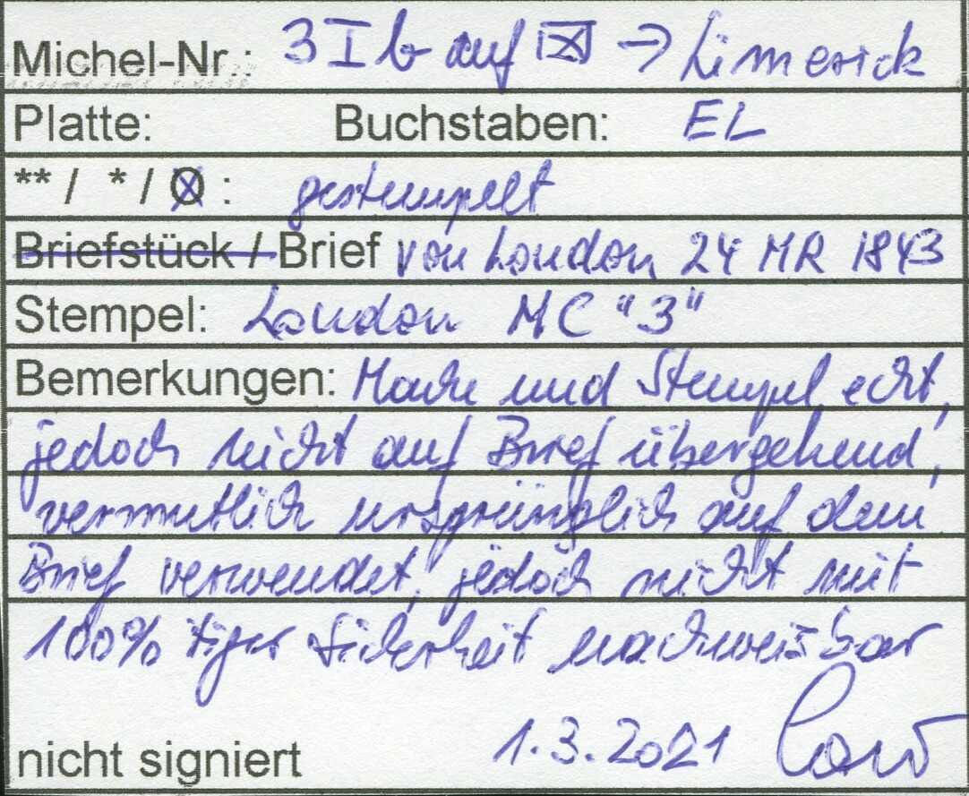 | Zusatzinformationen und Suchstichworte: | Loth 188. Auktion 28. - 29. Oktober 2022 Los 685 Grossbritannien 1 P., Randstück mit sehr klarem MX "3" auf kleinem Brief mit L2 "T.P. Wimbledon" nach Limerick, siehe Befund Louis Zuschlag 95,00 EUR |