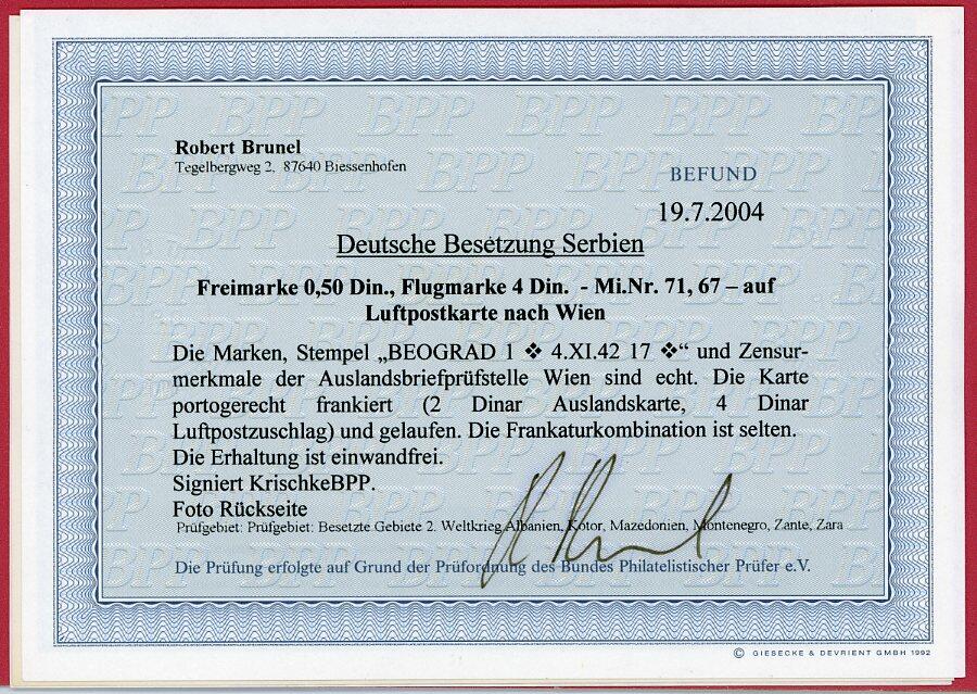 | Zusatzinformationen und Suchstichworte: | 24. Briefmarkenhandel Dessau Auktion 1. September 2022 Los 318 Deutsche Besetzung II. WK Serbien Ganzsache 1.50 Din. bedarfsgebraucht mit Zusatzfrankatur 4 Din. Flugpost und 0.50 Din. Freim.-Ausg. als Luftpostkarte nach Wien von "BEOGRAD 4.XI.44" mit OKW-Zensur, Foto-Attest Krischke BPP und Farbbefund Brunel BPP Zuschlag 80,00 EUR |
