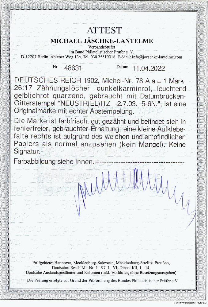 | Zusatzinformationen und Suchstichworte: | 73. Hadersbeck Auktion 26. - 27. Oktober 2022 Los 1502 Deutsches Reich, Germania ohne WZ 1 M. dunkelkarminrot, 26:17 Zähnungslöcher, gelblichrot quarzend, St. "NEUSTR(EL)ITZ 2.7.03 5-6N", Attest Jäschke-L. (04/22), KW 550,- Zuschlag 130,00 EUR |