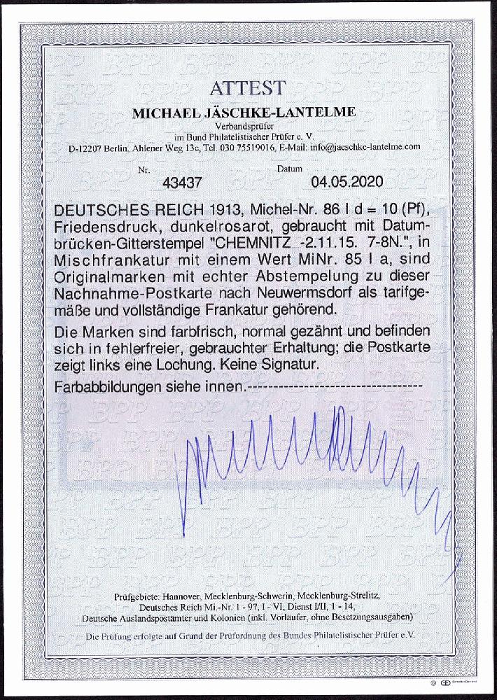 | Prüfer: | Jäschke-Lantelme, Michael (BPP (Bund Philatelistischer Prüfer)) |