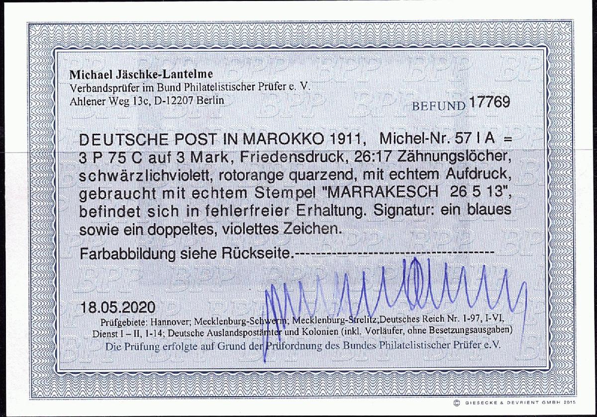 | Prüfgebiet: | Deutsche Auslandspostämter Marokko |