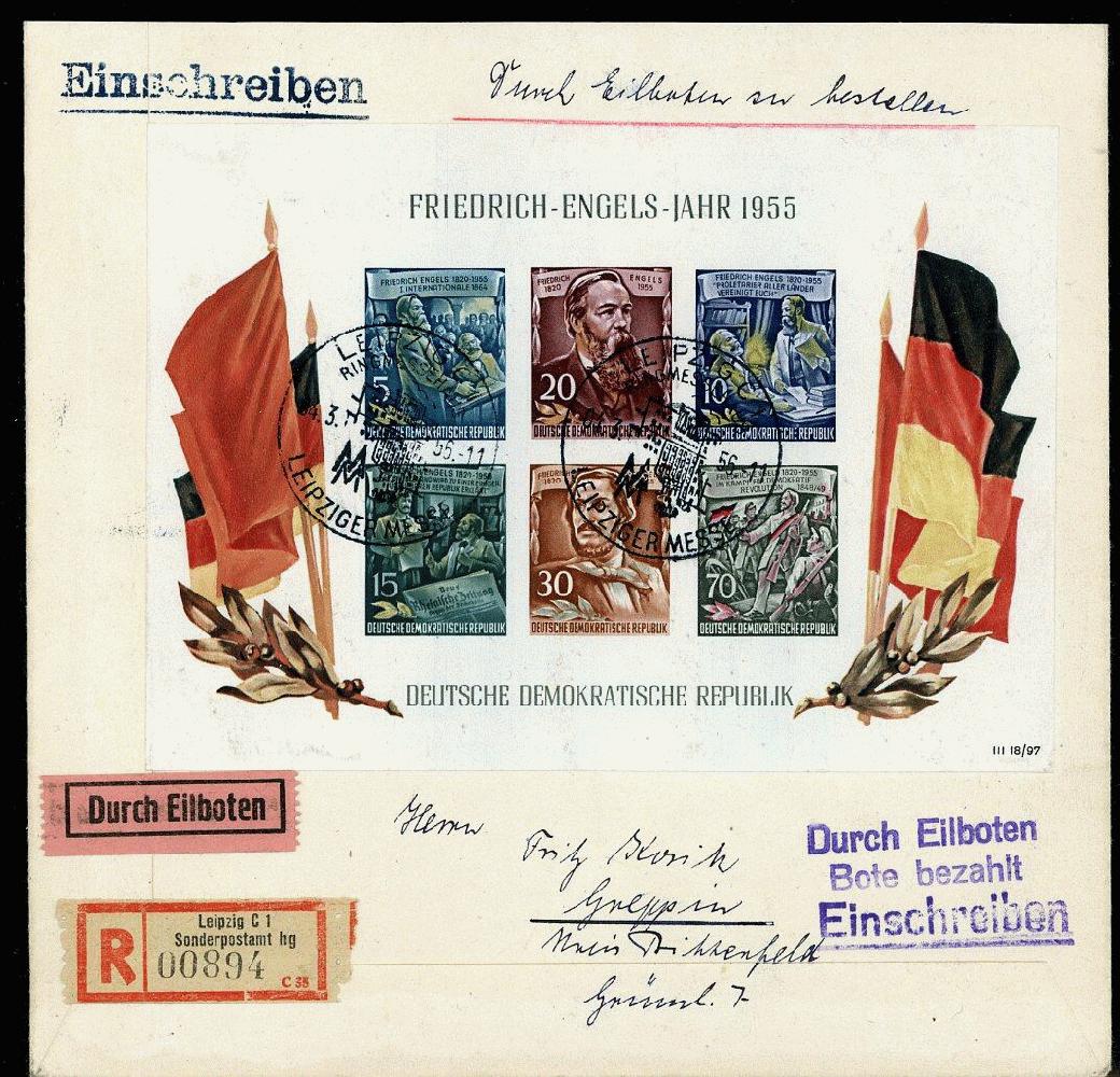 | Zusatzinformationen und Suchstichworte: | 24. Briefmarkenhandel Dessau Auktion 1. September 2022 Los 763 DDR Engels - Block 13 (Type YII) als EF portogenau auf Eilboten-R-Fernbrief mit SoSt. "LEIPZIG 4.3.56", adressiert nach Greppin, rücks. Ank.-Stpl., aktuelles Foto-Attest König BPP, Mi. 500,-€ Zuschlag 180,00 EUR |