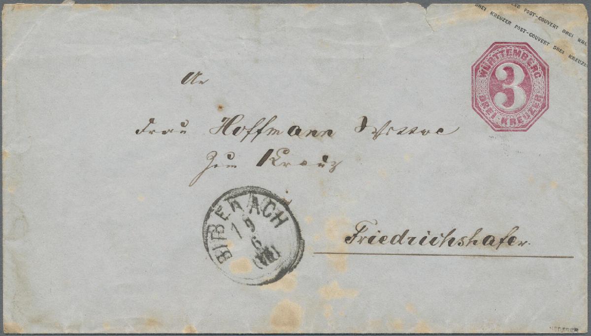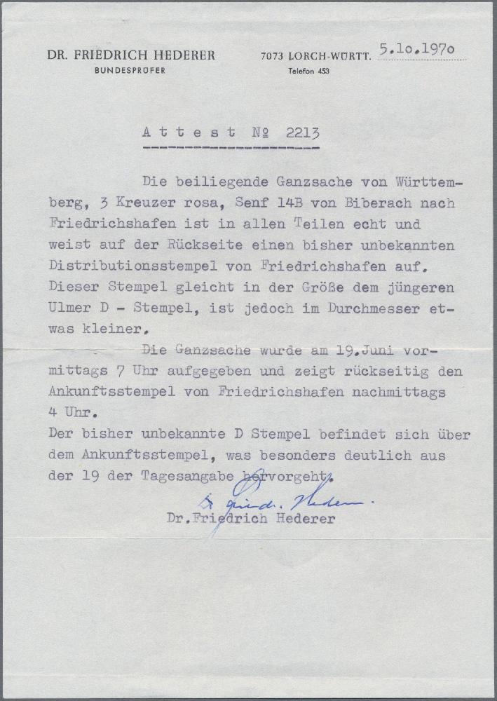 | Zusatzinformationen und Suchstichworte: | Auction Galleries Hamburg 25. Auktion 2. - 3. September 2022 Los 1089 Altdeutschland Württemberg FRIEDRICHSHAFEN, Distributions-Stempel "D3" rückseitig auf Ganzsachenumschlag 3 Kr., Altersfleckchen, Attest Thoma bzw. Dr. Hederer von 1970, dem dieser Stempel noch unbekannt war Ausruf 70,00 EUR |