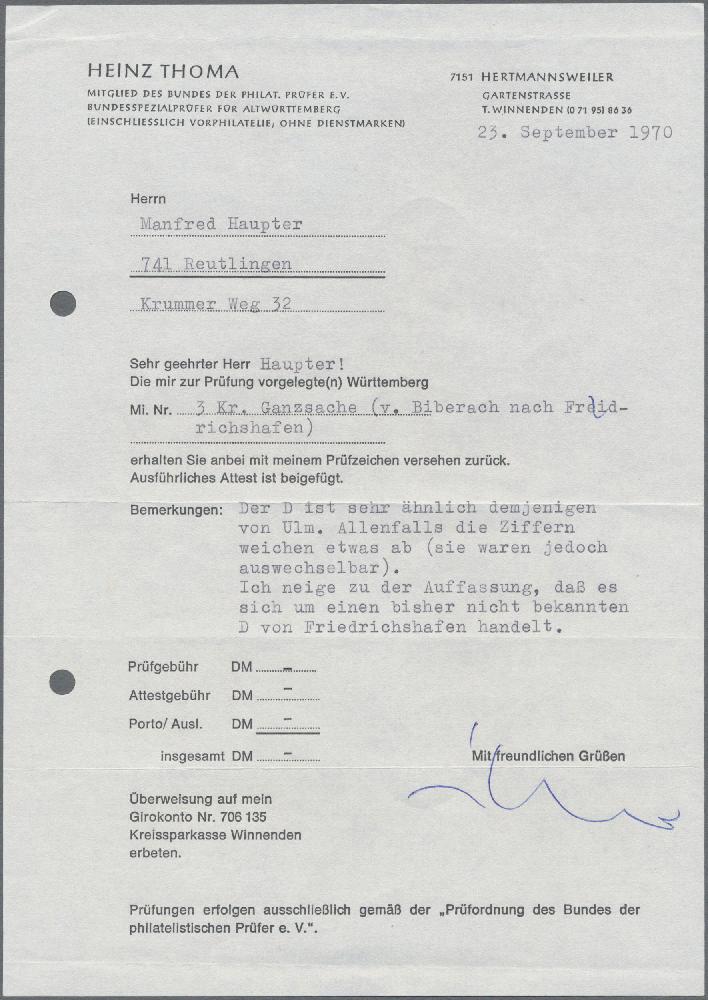 | Zusatzinformationen und Suchstichworte: | Auction Galleries Hamburg 25. Auktion 2. - 3. September 2022 Los 1089 Altdeutschland Württemberg FRIEDRICHSHAFEN, Distributions-Stempel "D3" rückseitig auf Ganzsachenumschlag 3 Kr., Altersfleckchen, Attest Thoma bzw. Dr. Hederer von 1970, dem dieser Stempel noch unbekannt war Ausruf 70,00 EUR |
