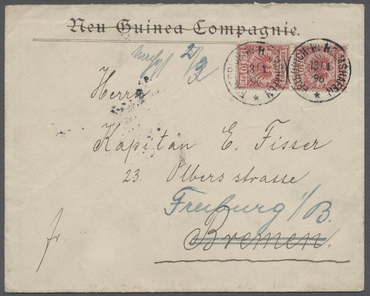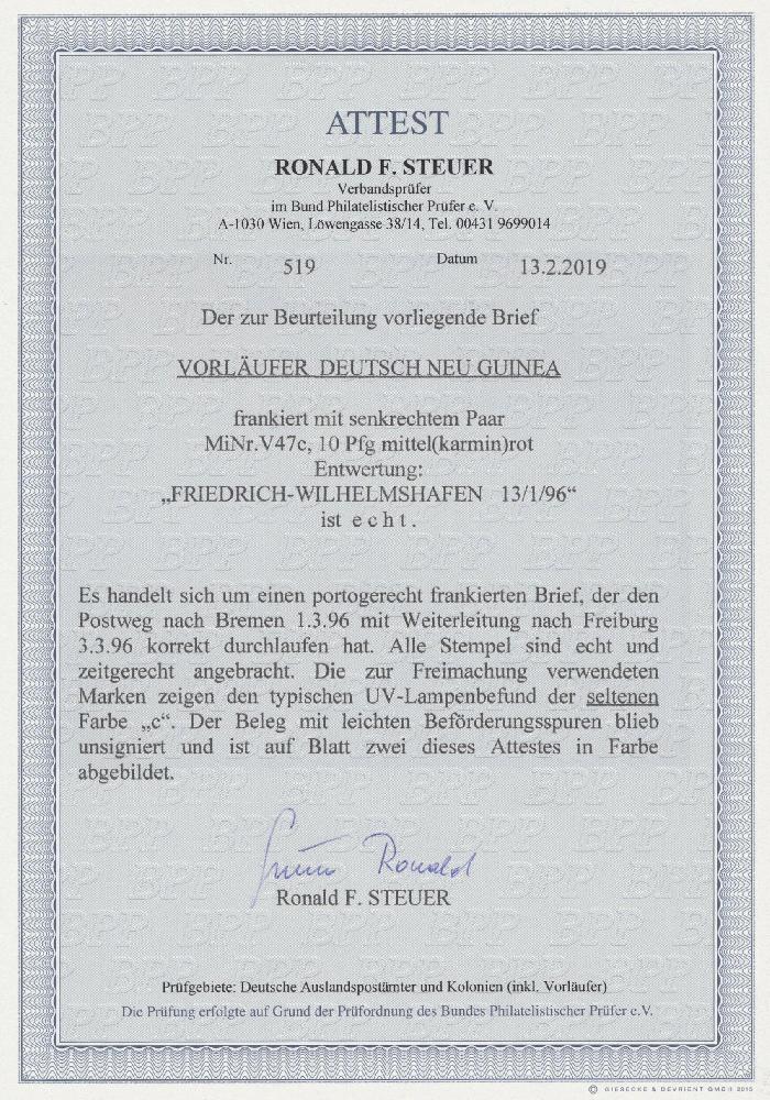 | Zusatzinformationen und Suchstichworte: | Auction Galleries Hamburg 25. Auktion 2. - 3. September 2022 Los 1254 Deutsche Kolonien Neuguinea, Vorläufer 1896, Krone / Adler, 10 Pfg. mittel(karmin)rot, senkrechtes Paar in der als Vorläufer guten c-Farbe, beide Werte sauber entwertet "Friedrich-Wilhelmshafen / 18 1 96" auf portogerechtem Brief aus Friedrich-Wilhelmshafen nach Bremen, von dort weitergeleitet nach Freiburg / Breisgau. Laut Attest Steuer BPP (2019) mit leichten Beförderungsspuren, aber sehr schöner Beleg, rs. Transit- und Ankunftstempel Bremen und Freiburg Ausruf 250,00 EUR |