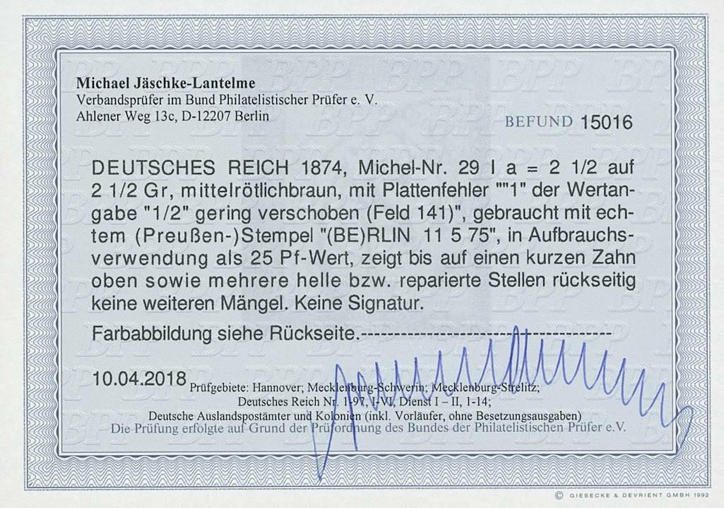 | Prüfgebiet: | Deutsches Reich 1871 - 1918 (Mi-Nr. 1 - 106) |