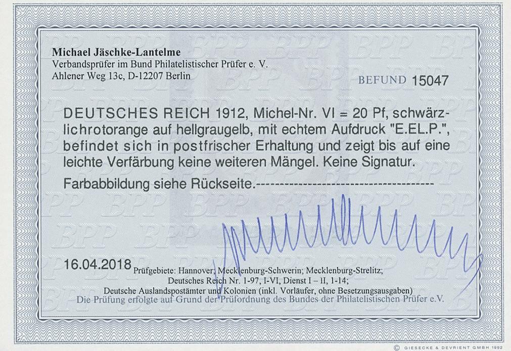 | Zusatzinformationen und Suchstichworte: | Ulrich Felzmann 34. e@uction 5. - 9. September 2022 Los 13325 Deutsches Reich 20 Pfg E.EL.P, postfrisch mit bildseitiger Verfärbung, Attest Sieger und Befund Jäschke-L. BPP Zuschlag 45,00 EUR |