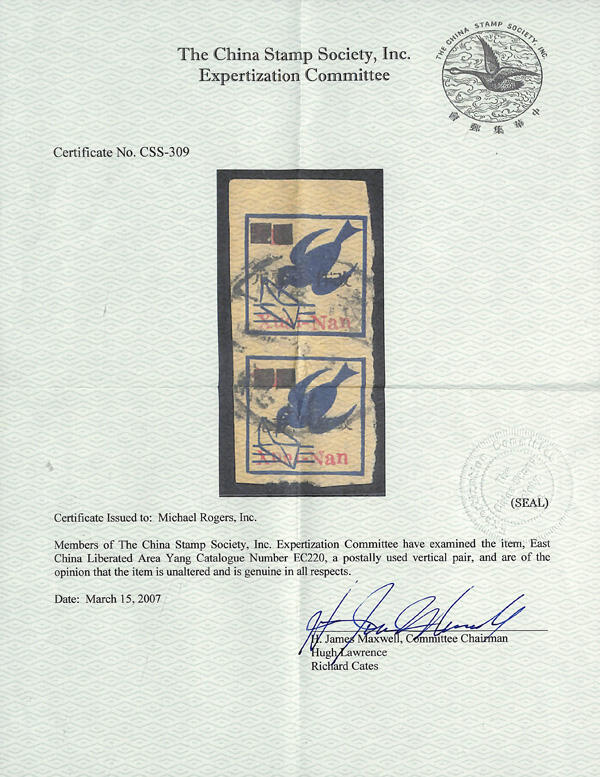 | Zusatzinformationen und Suchstichworte: | Kelleher & Rogers - 38. Auktion 30. November - 1. Dezember 2022 Los 418 China VR Befreite Gebiete 1943, Hwai Nan machine re-surcharge on First Issue with new denomination (Yang EC220), cleanly printed with full to large margins, neat postmark in black, without gum as issued, Very Fine, with 2007 C.S.S. certificate for vertical pair, this the top stamp. GEBOT |